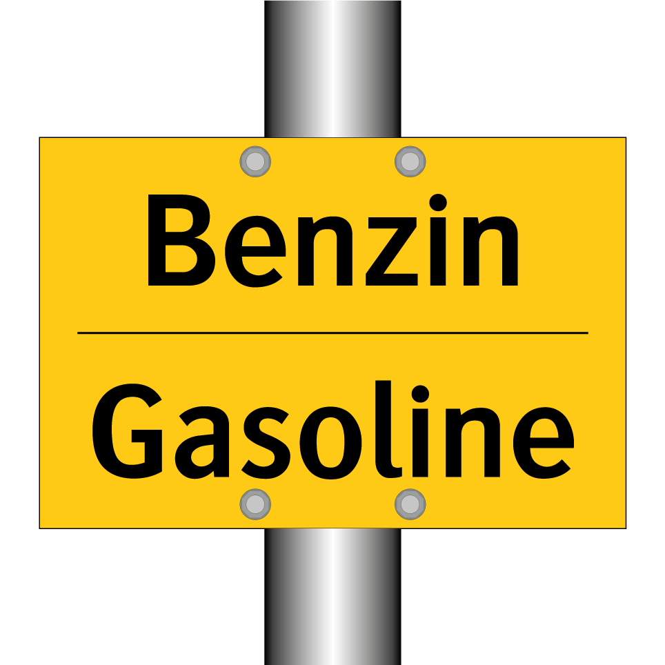 Zweisprachiges Warnschild mit deutschem Text Benzin und englischem Text Gasoline