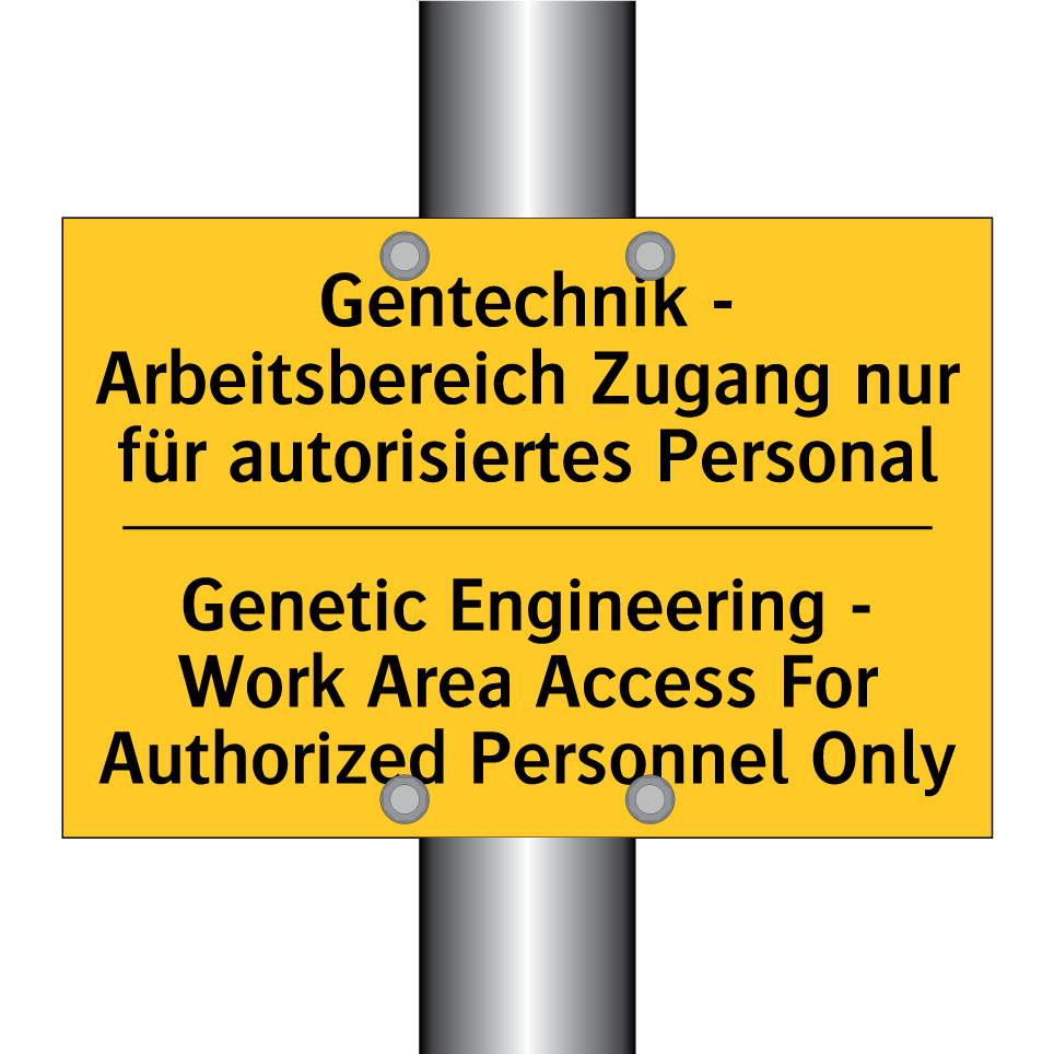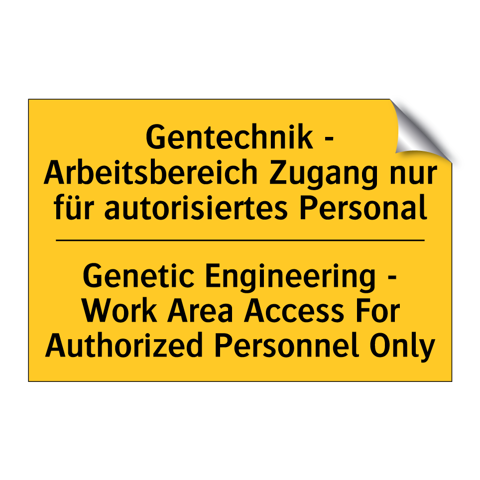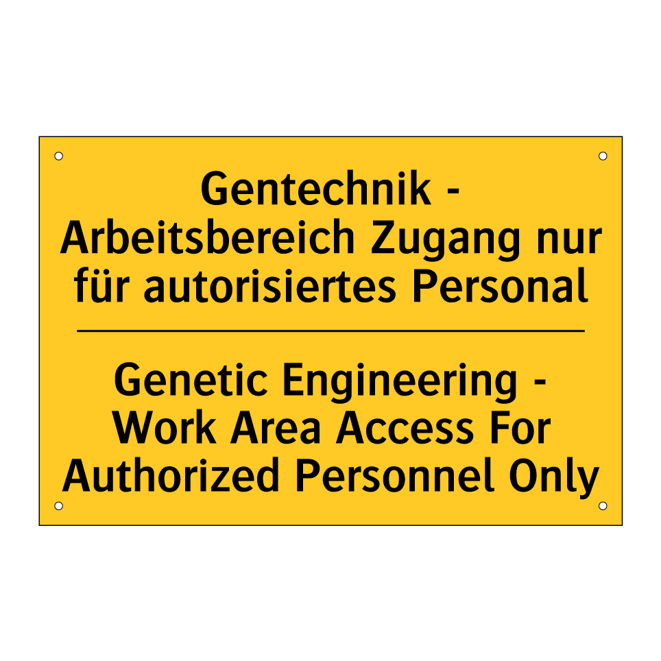 Zweisprachiges Warnschild mit deutschem Text Gentechnik - Arbeitsbereich Zugang nur für autorisiertes Personal und englischem Text Genetic Engineering - Work Area Access For Authorized Personnel Only