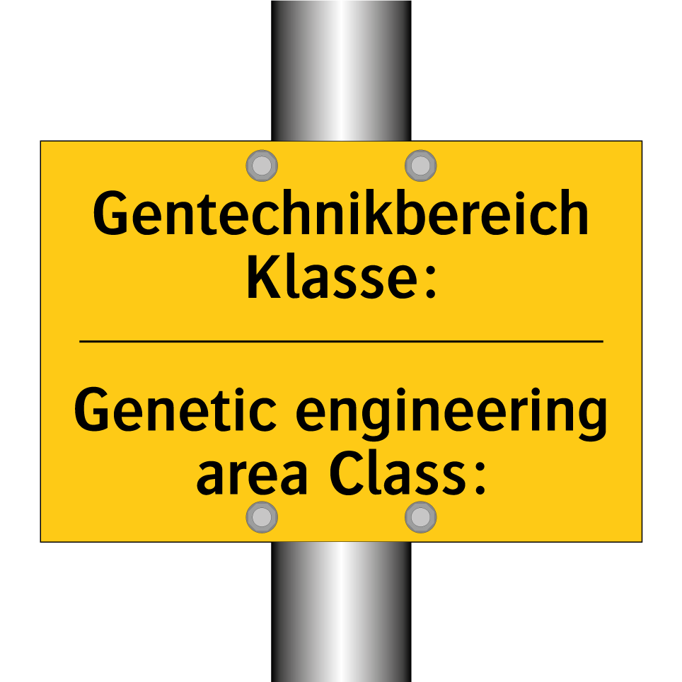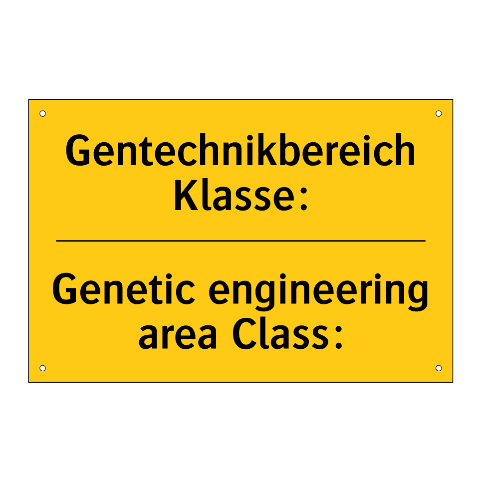 Zweisprachiges Warnschild mit deutschem Text Gentechnikbereich Klasse: und englischem Text Genetic engineering area Class: