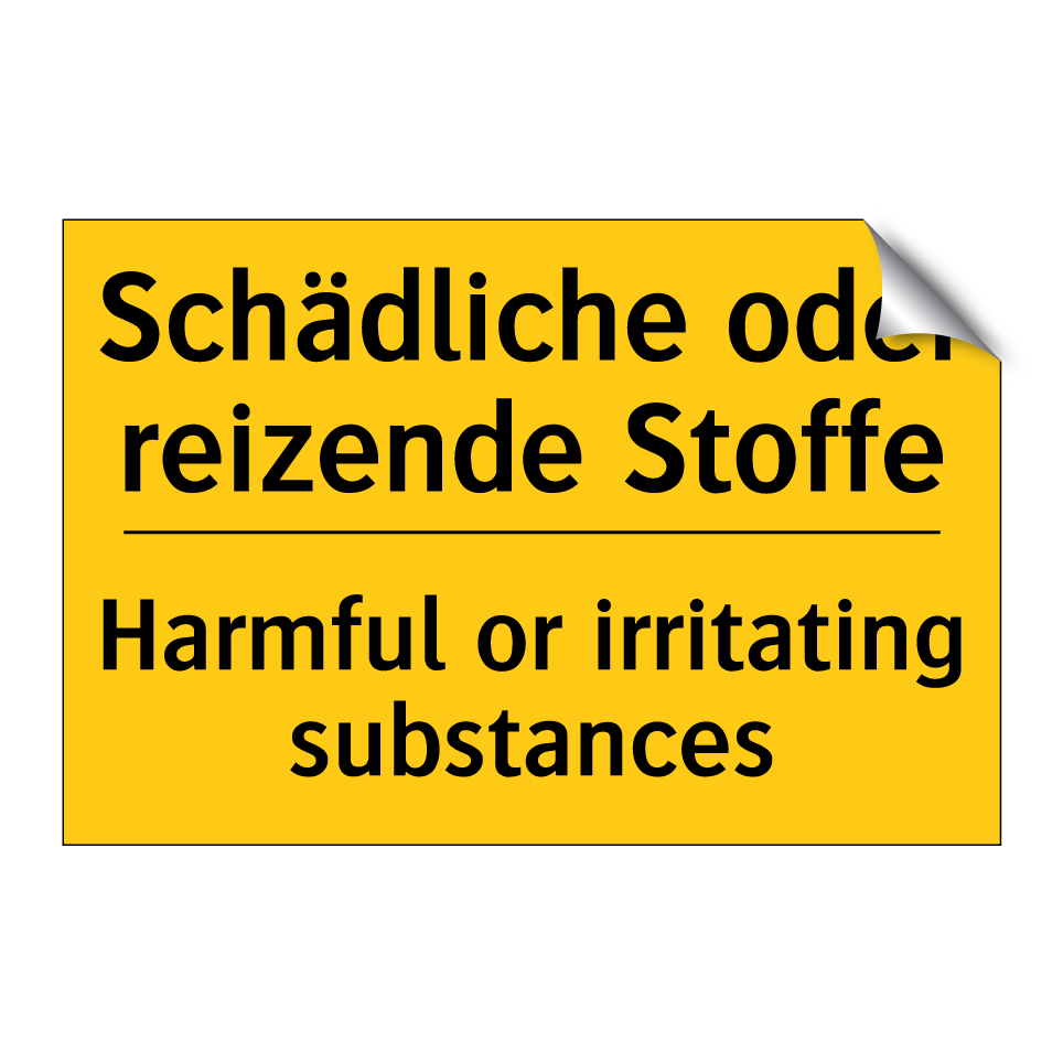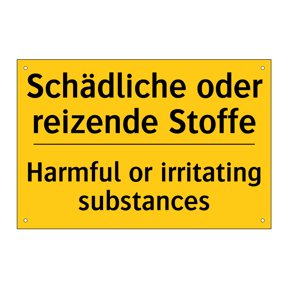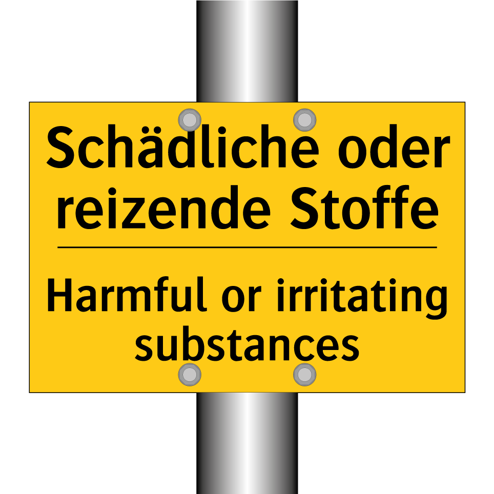 Zweisprachiges Warnschild mit deutschem Text Schädliche oder reizende Stoffe und englischem Text Harmful or irritating substances
