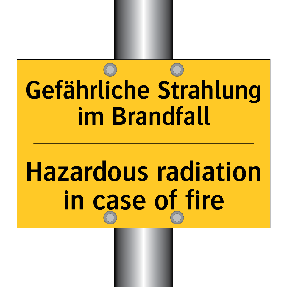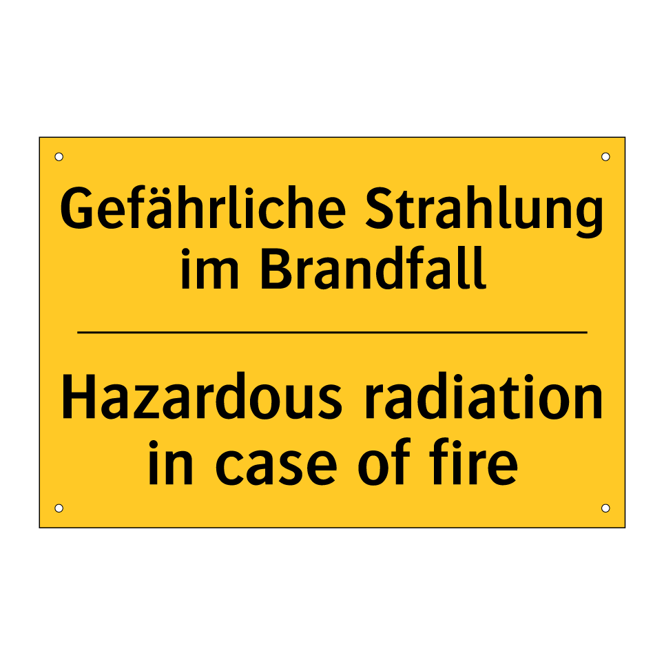 Zweisprachiges Warnschild mit deutschem Text Gefährliche Strahlung im Brandfall und englischem Text Hazardous radiation in case of fire
