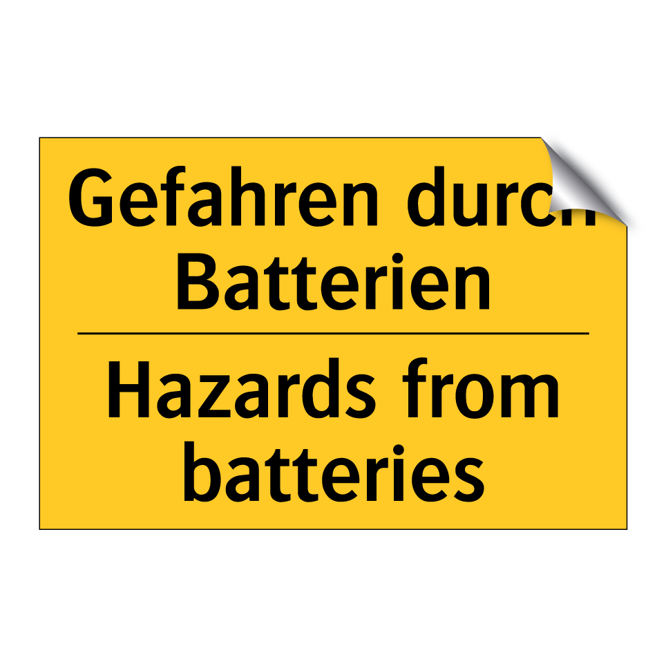 Zweisprachiges Warnschild mit deutschem Text Gefahren durch Batterien und englischem Text Hazards from batteries