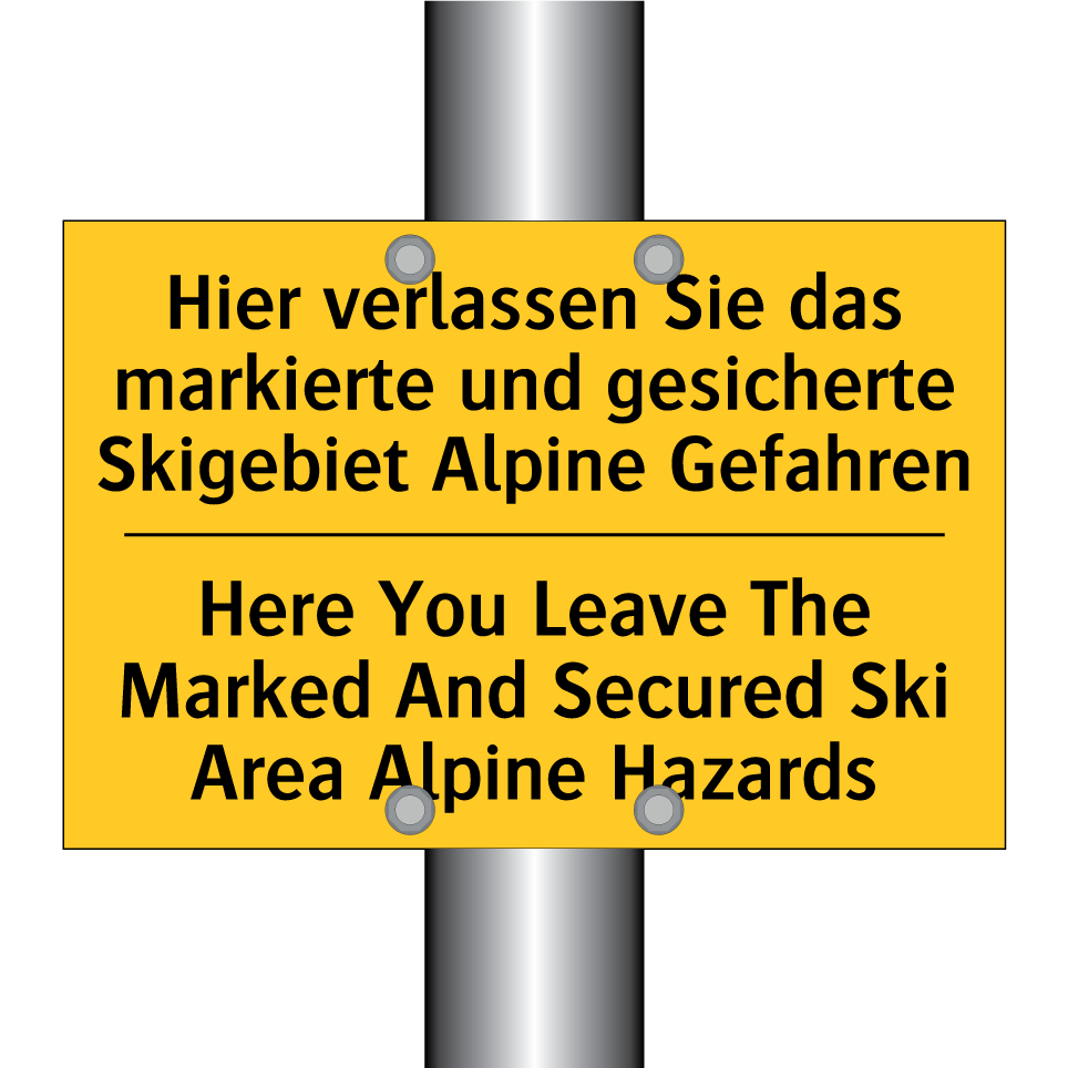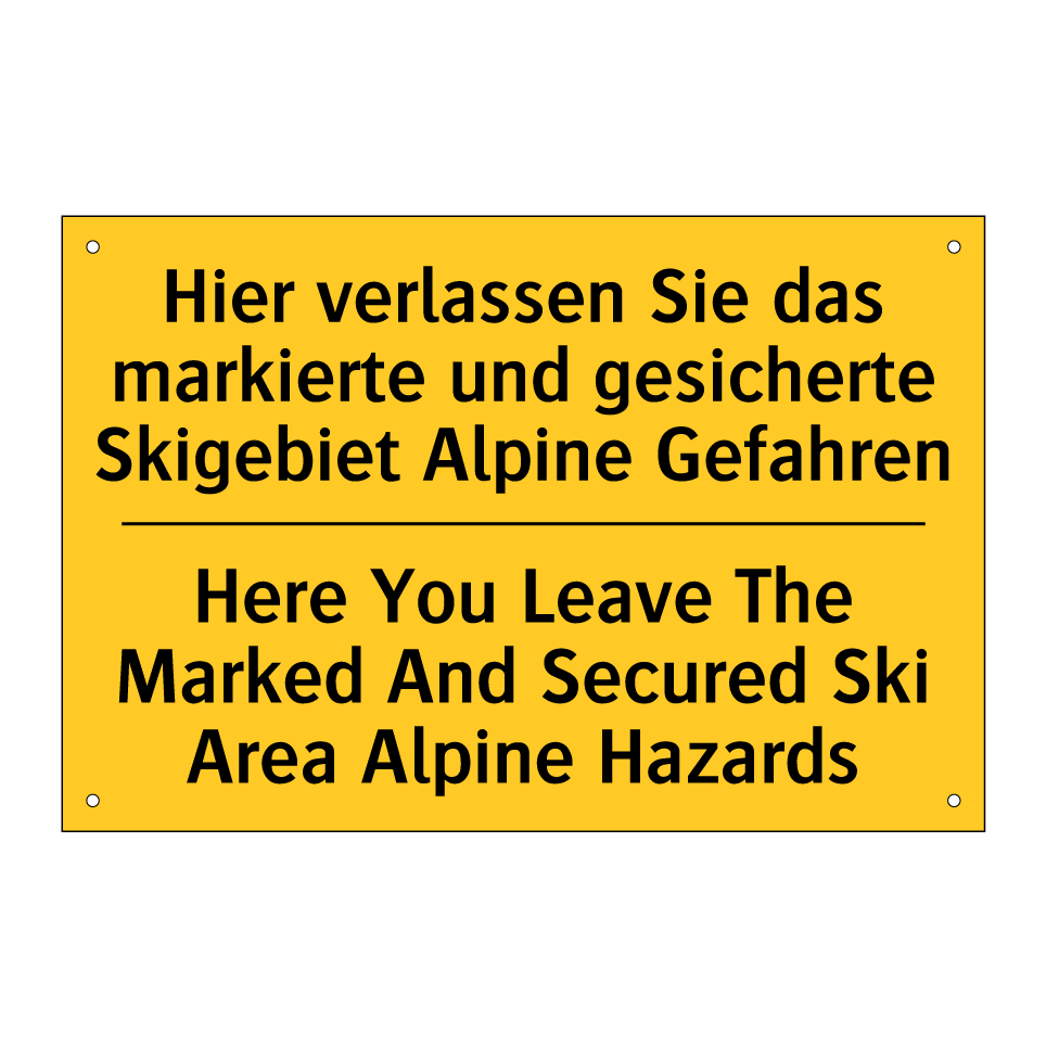 Zweisprachiges Warnschild mit deutschem Text Hier verlassen Sie das markierte und gesicherte Skigebiet Alpine Gefahren und englischem Text Here You Leave The Marked And Secured Ski Area Alpine Hazards