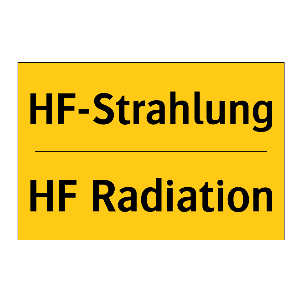 Zweisprachiges Warnschild mit deutschem Text HF-Strahlung und englischem Text HF Radiation