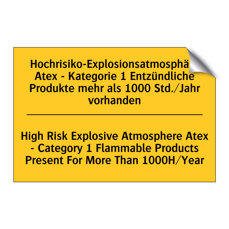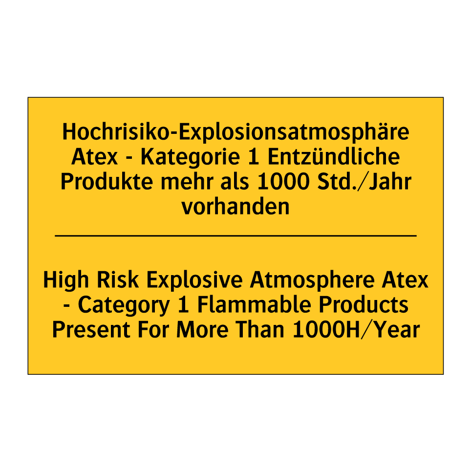 Zweisprachiges Warnschild mit deutschem Text Hochrisiko-Explosionsatmosphäre Atex - Kategorie 1 Entzündliche Produkte mehr als 1000 Std./Jahr vorhanden und englischem Text High Risk Explosive Atmosphere Atex - Category 1 Flammable Products Present For More Than 1000H/Year