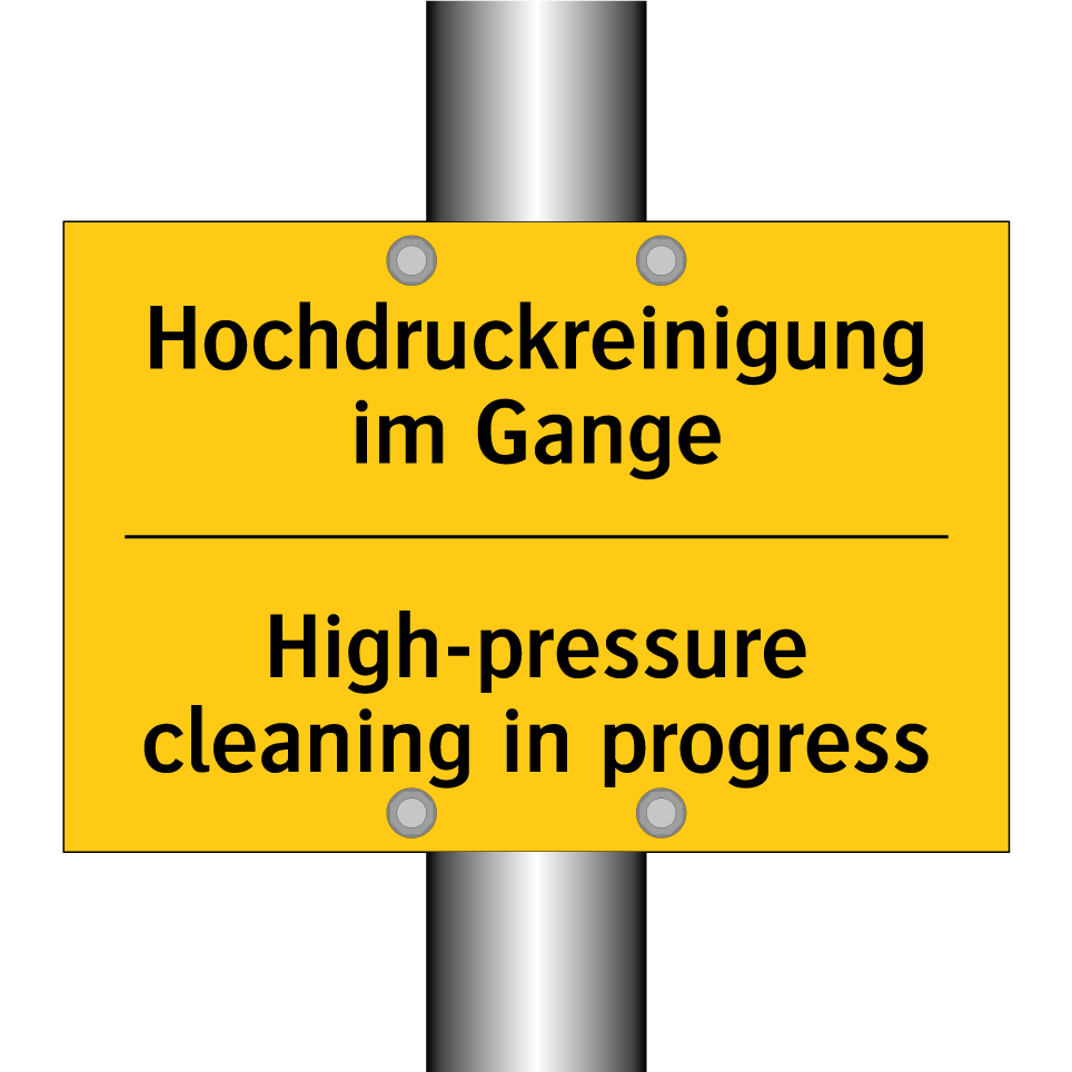 Zweisprachiges Warnschild mit deutschem Text Hochdruckreinigung im Gange und englischem Text High-pressure cleaning in progress