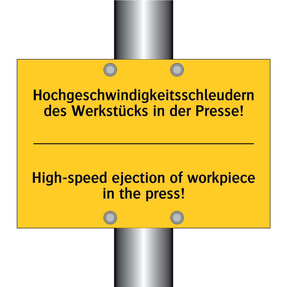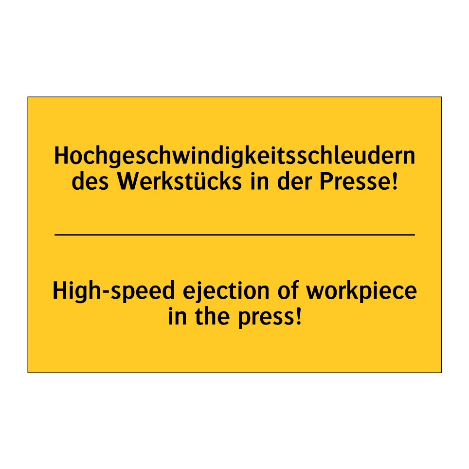 Zweisprachiges Warnschild mit deutschem Text Hochgeschwindigkeitsschleudern des Werkstücks in der Presse! und englischem Text High-speed ejection of workpiece in the press!