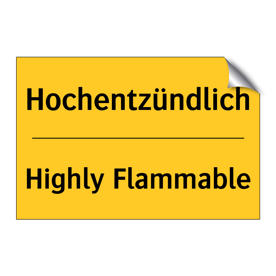 Zweisprachiges Warnschild mit deutschem Text Hochentzündlich und englischem Text Highly Flammable