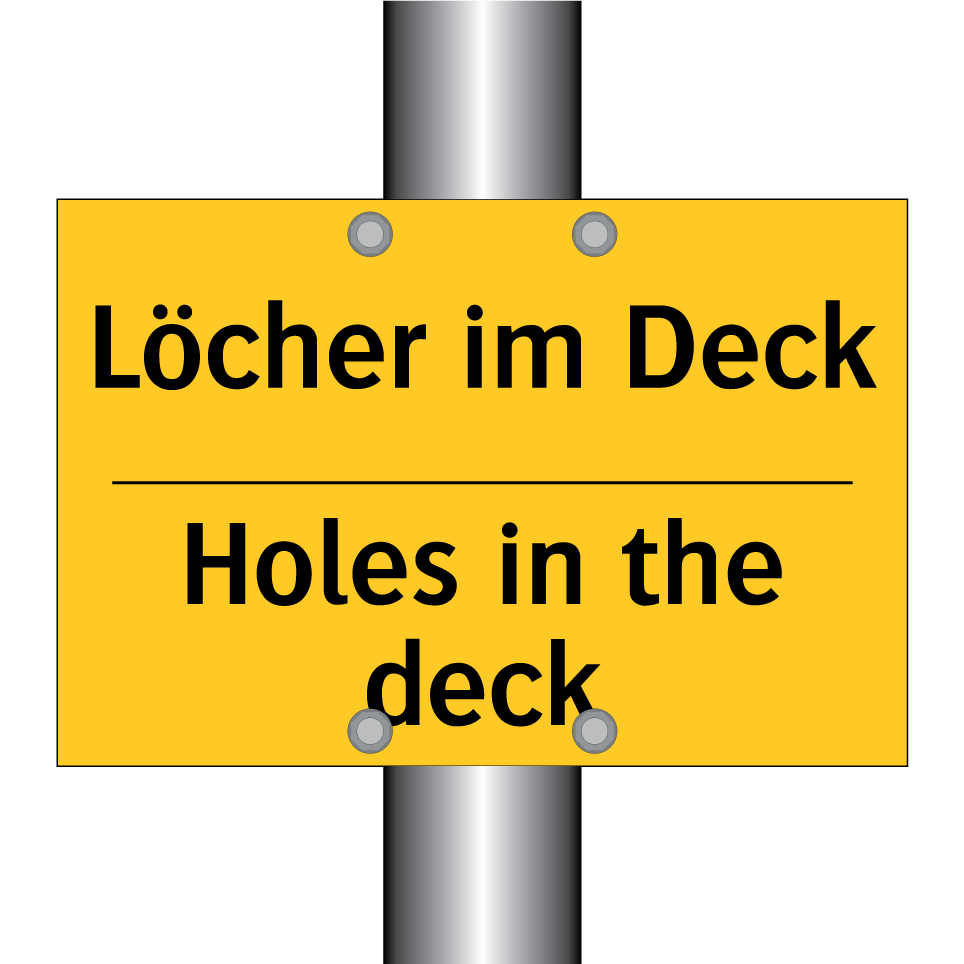 Zweisprachiges Warnschild mit deutschem Text Löcher im Deck und englischem Text Holes in the deck