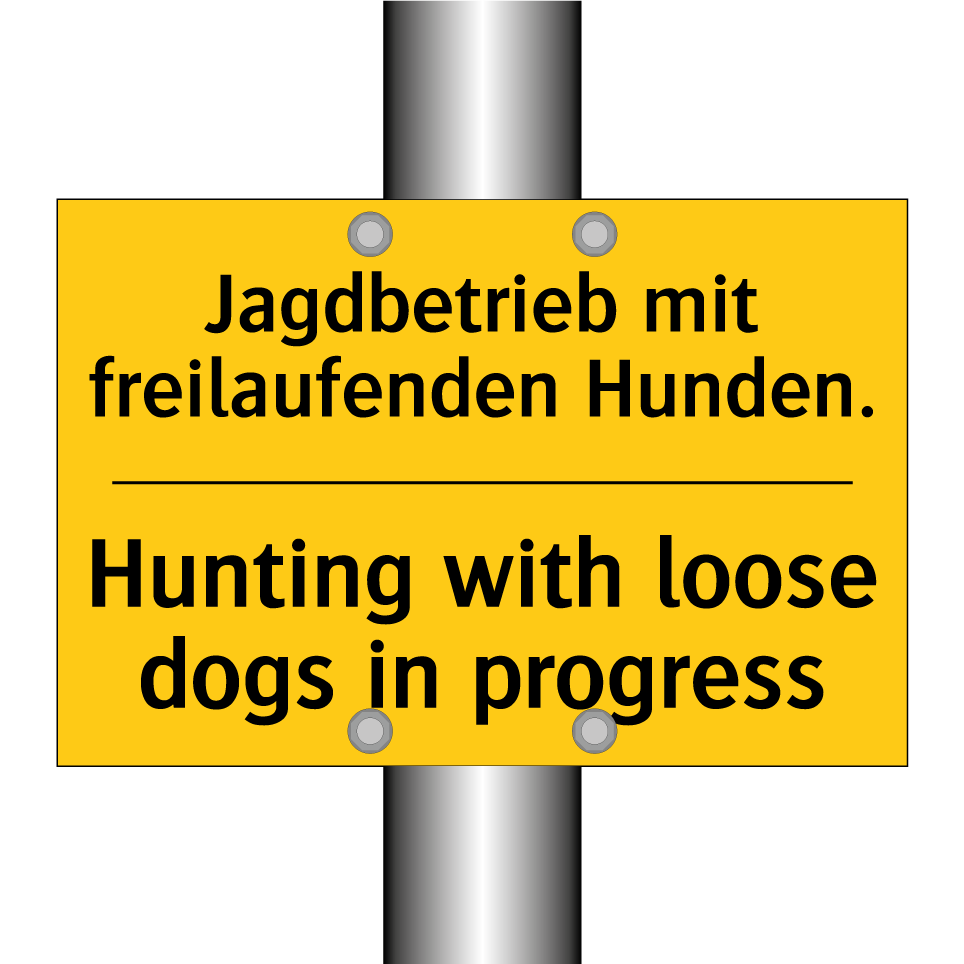 Zweisprachiges Warnschild mit deutschem Text Jagdbetrieb mit freilaufenden Hunden. und englischem Text Hunting with loose dogs in progress