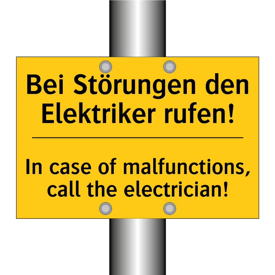 Zweisprachiges Warnschild mit deutschem Text Bei Störungen den Elektriker rufen! und englischem Text In case of malfunctions, call the electrician!