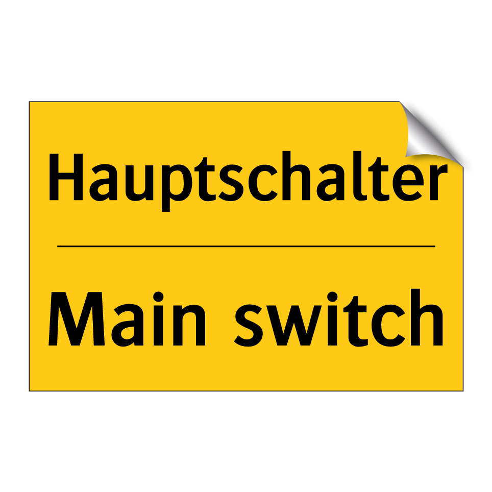 Zweisprachiges Warnschild mit deutschem Text Hauptschalter und englischem Text Main switch