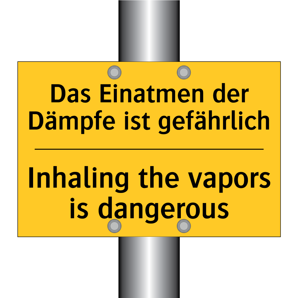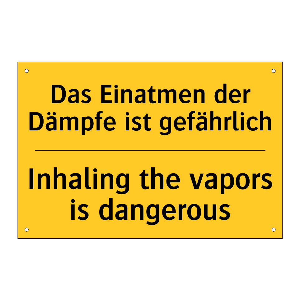 Entdecken Sie die Vielseitigkeit dieser zweisprachigen Warnschild, die sowohl auf Deutsch als auch auf Englisch wichtige Sicherheitsinformationen vermittelt. Diese Warnschilder sind ideal für den Einsatz in Bereichen, in denen gefährliche Dämpfe auftreten können, wie in Laboren, Fabriken oder Werkstätten. Die auffällige gelbe Hintergrundfarbe mit schwarzem Text sorgt dafür, dass die Botschaft klar und deutlich wahrgenommen wird. Durch die zweisprachige Gestaltung wird sichergestellt, dass sowohl deutsch- als auch englischsprachige Personen die Warnung verstehen, was die Sicherheit in internationalen oder multikulturellen Umgebungen erhöht. Platzieren Sie diese Warnschild an gut sichtbaren Stellen, um das Bewusstsein für potenzielle Gefahren zu schärfen und die Sicherheit zu gewährleisten.