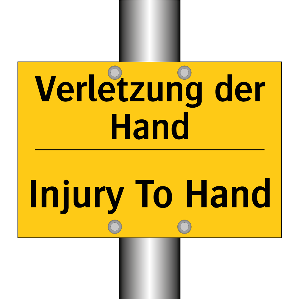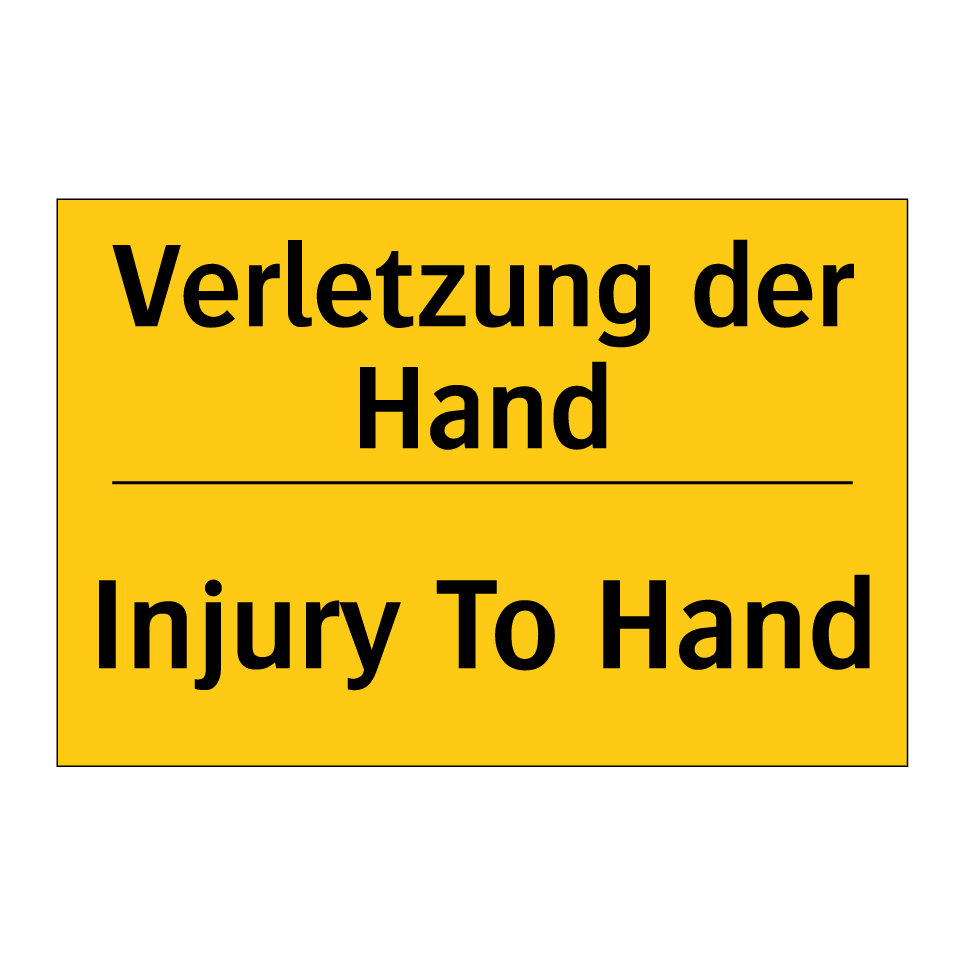 Zweisprachiges Warnschild mit deutschem Text Verletzung der Hand und englischem Text Injury To Hand