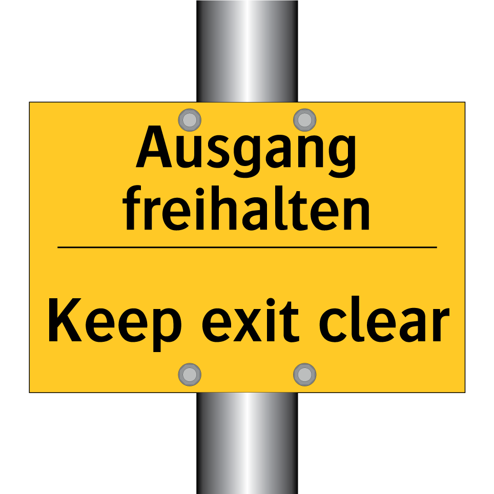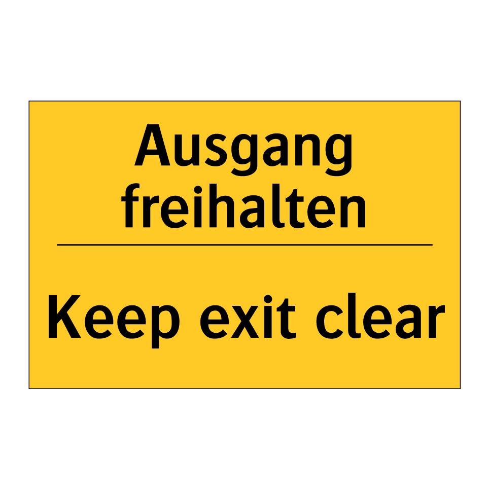 Zweisprachiges Warnschild mit deutschem Text Ausgang freihalten und englischem Text Keep exit clear