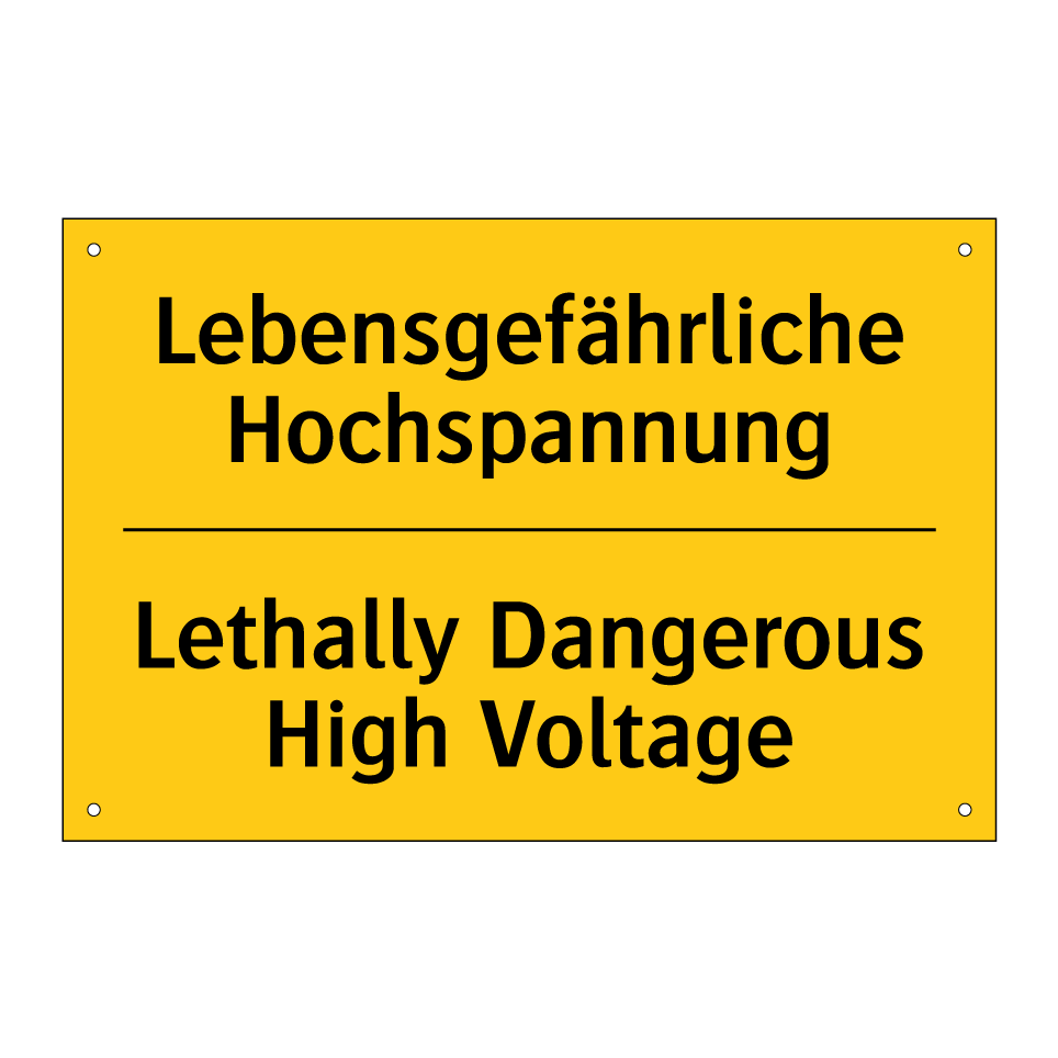 Zweisprachiges Warnschild mit deutschem Text Lebensgefährliche Hochspannung und englischem Text Lethally Dangerous High Voltage