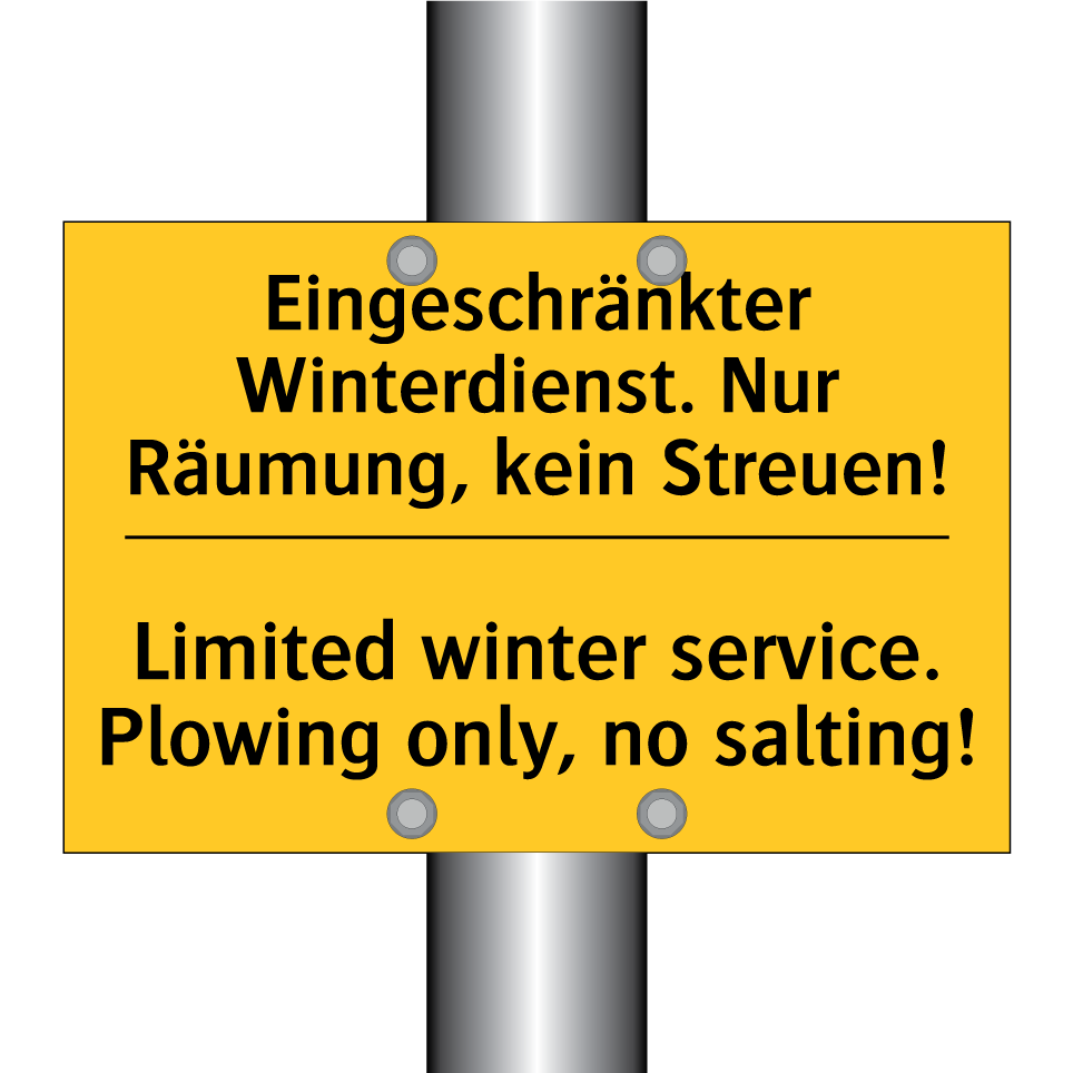 Zweisprachiges Warnschild mit deutschem Text Eingeschränkter Winterdienst. Nur Räumung, kein Streuen! und englischem Text Limited winter service. Plowing only, no salting!