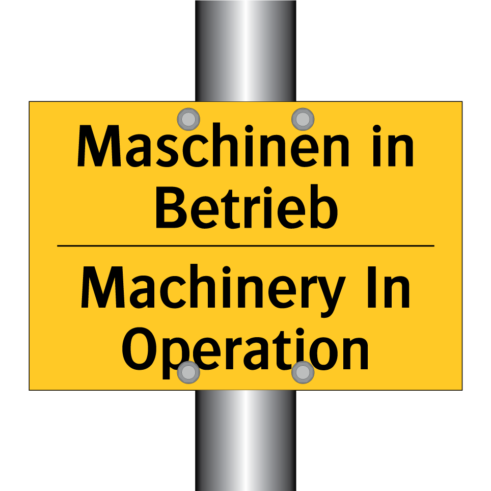 Zweisprachiges Warnschild mit deutschem Text Maschinen in Betrieb und englischem Text Machinery In Operation