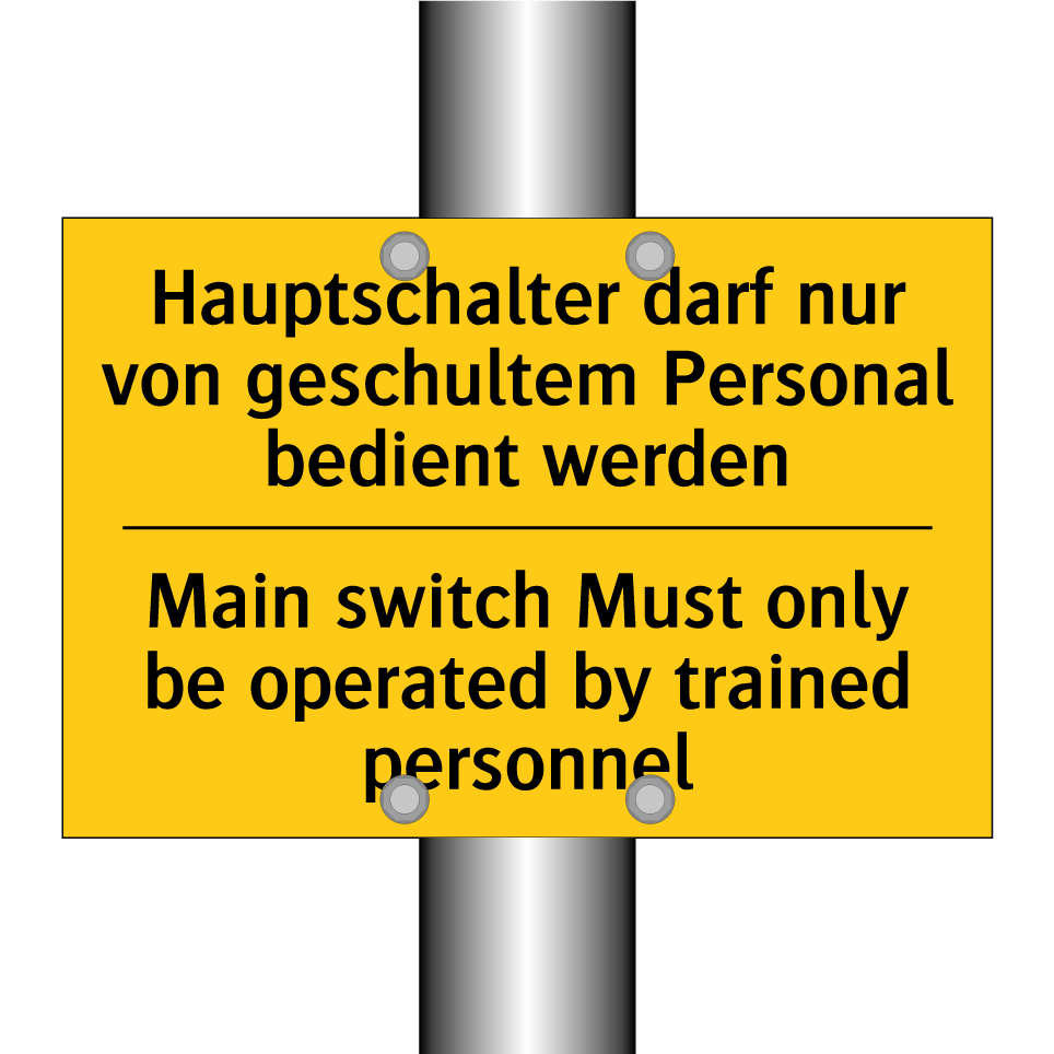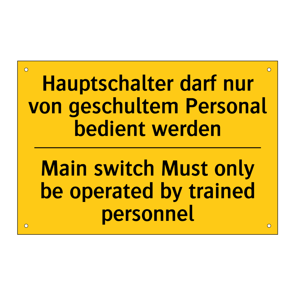 Zweisprachiges Warnschild mit deutschem Text Hauptschalter darf nur von geschultem Personal bedient werden und englischem Text Main switch Must only be operated by trained personnel