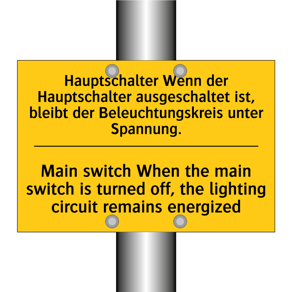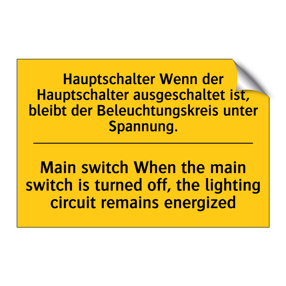Zweisprachiges Warnschild mit deutschem Text Hauptschalter Wenn der Hauptschalter ausgeschaltet ist, bleibt der Beleuchtungskreis unter Spannung. und englischem Text Main switch When the main switch is turned off, the lighting circuit remains energized