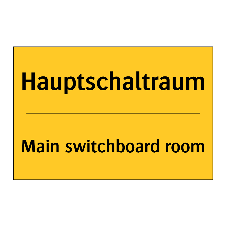 Zweisprachiges Warnschild mit deutschem Text Hauptschaltraum und englischem Text Main switchboard room