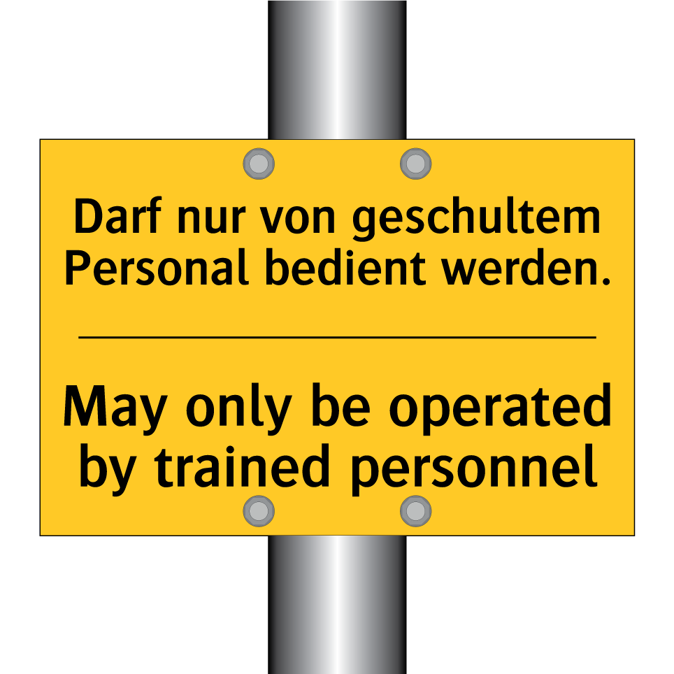 Zweisprachiges Warnschild mit deutschem Text Darf nur von geschultem Personal bedient werden. und englischem Text May only be operated by trained personnel