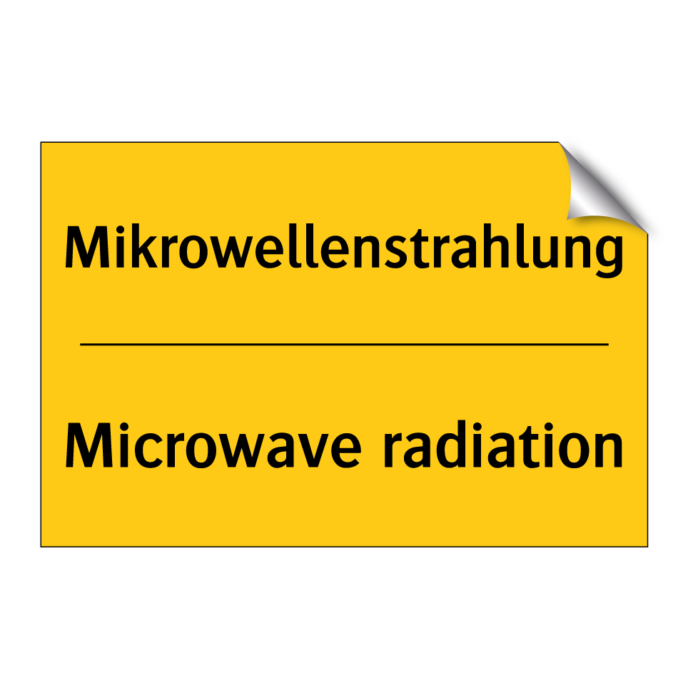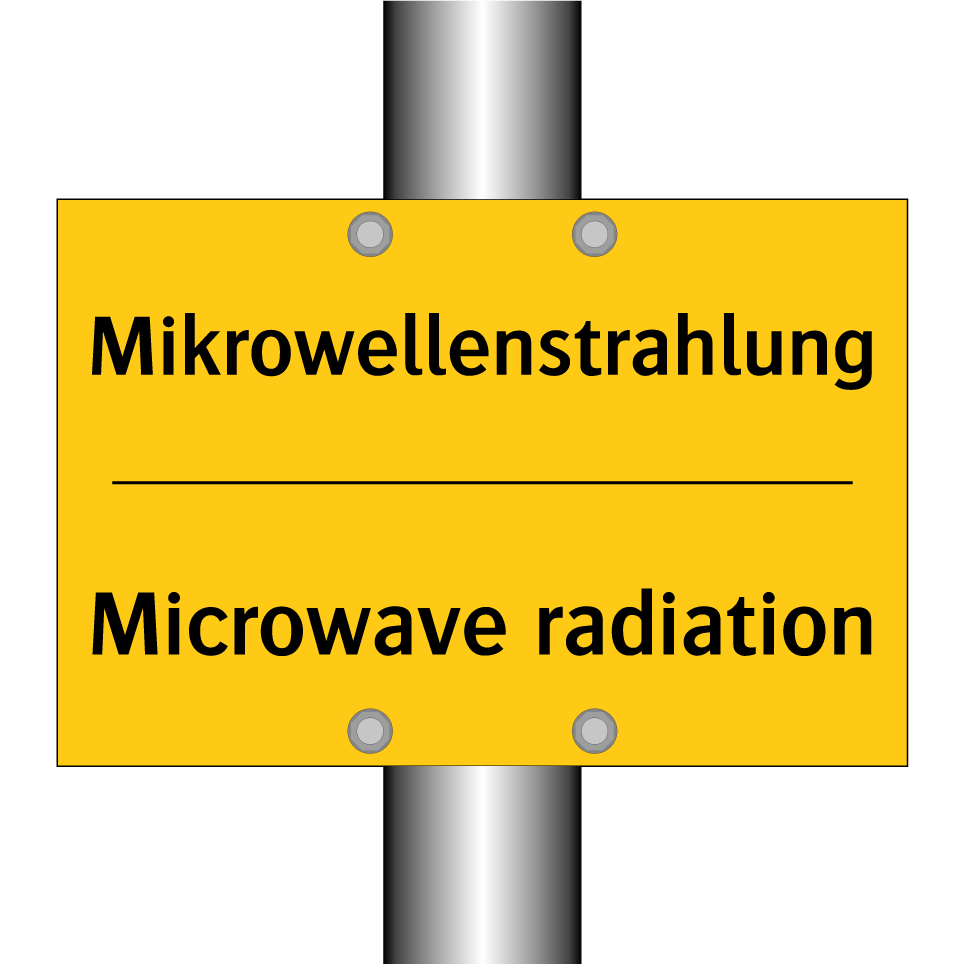 Zweisprachiges Warnschild mit deutschem Text Mikrowellenstrahlung und englischem Text Microwave radiation