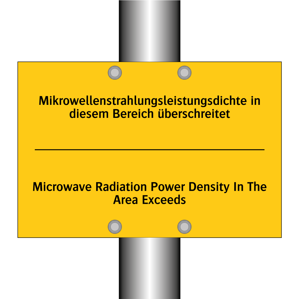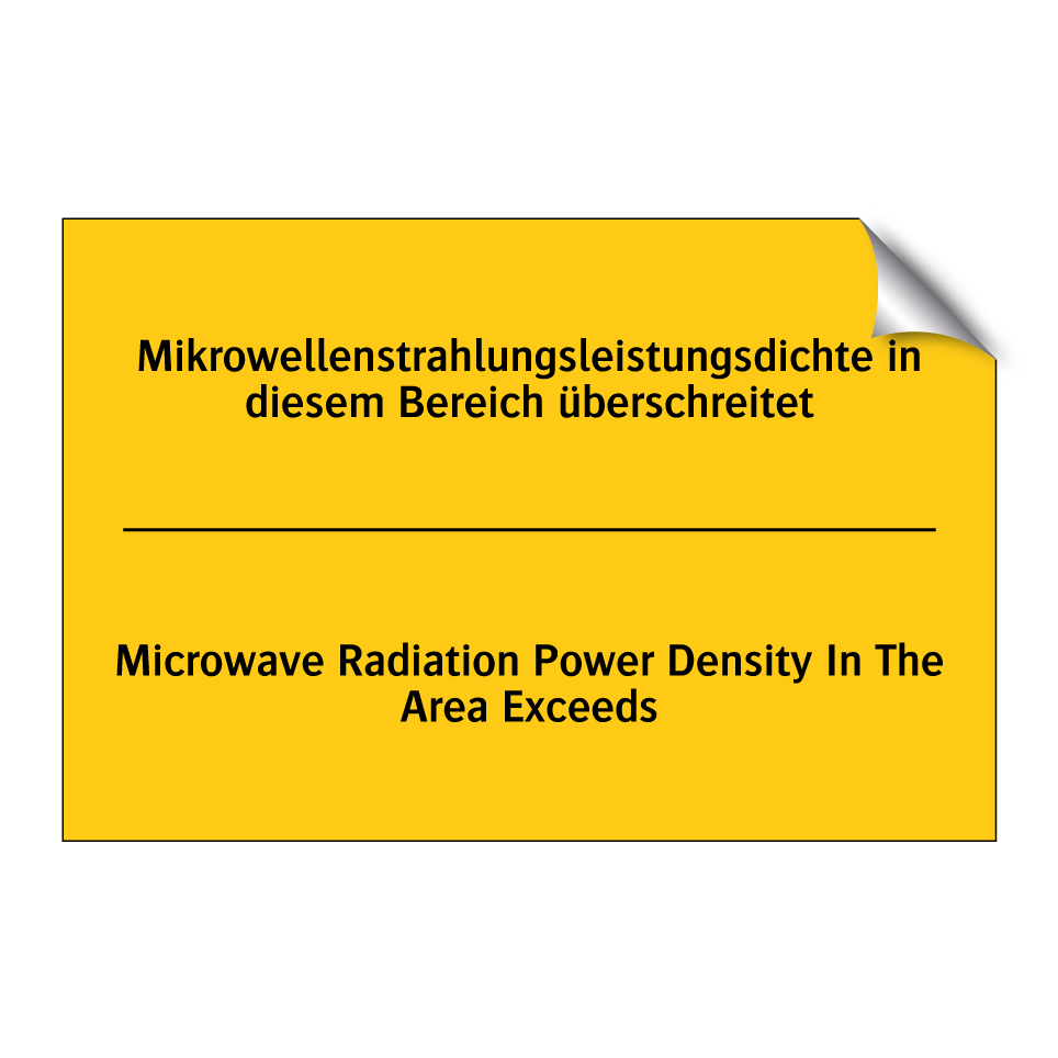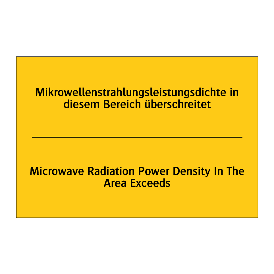 Zweisprachiges Warnschild mit deutschem Text Mikrowellenstrahlungsleistungsdichte in diesem Bereich überschreitet und englischem Text Microwave Radiation Power Density In The Area Exceeds