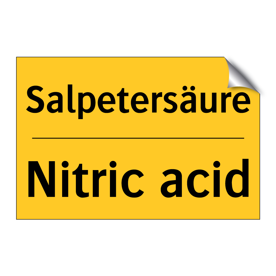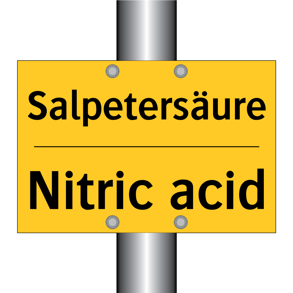 Zweisprachiges Warnschild mit deutschem Text Salpetersäure und englischem Text Nitric acid