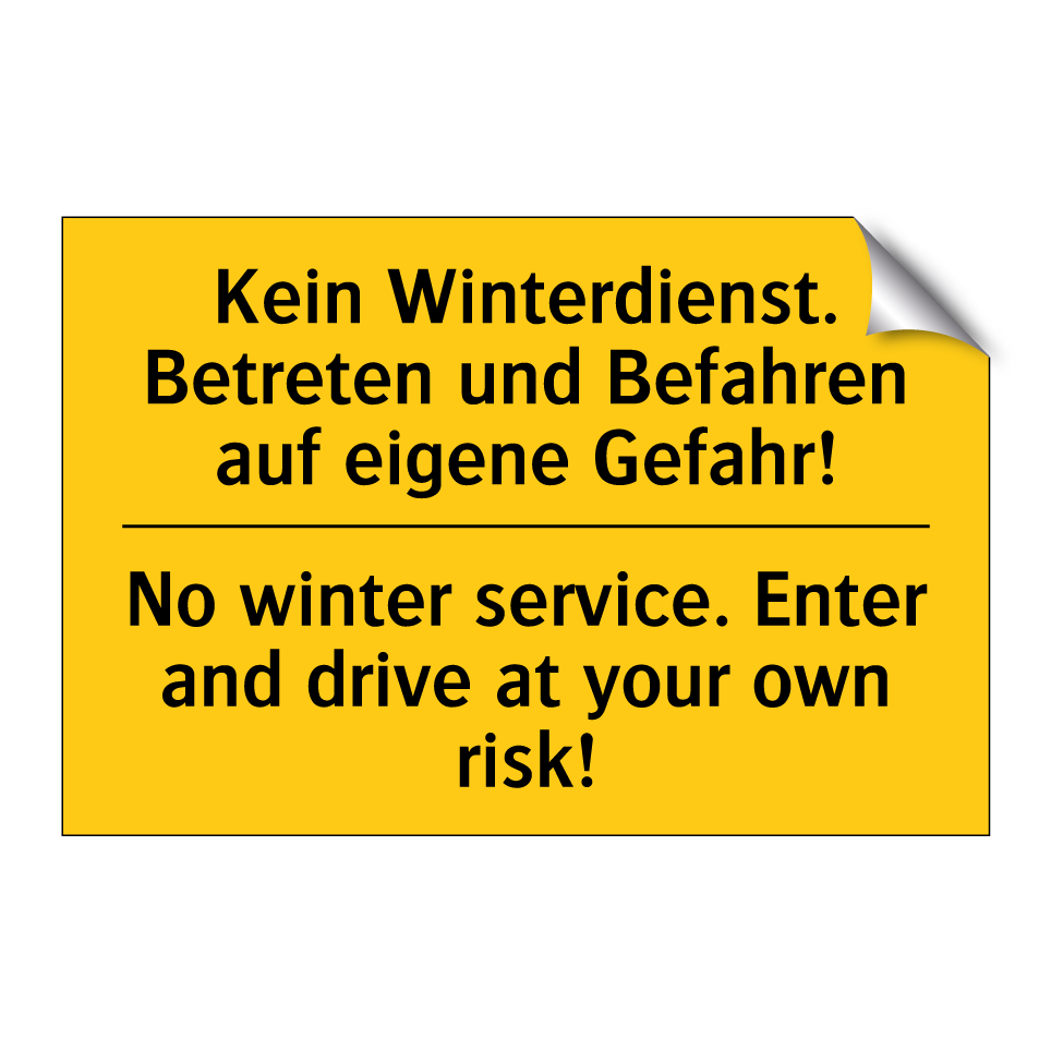 Zweisprachiges Warnschild mit deutschem Text Kein Winterdienst. Betreten und Befahren auf eigene Gefahr! und englischem Text No winter service. Enter and drive at your own risk!
