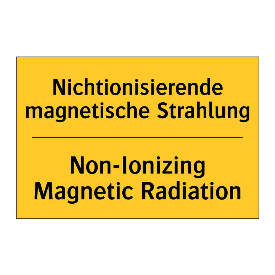 Zweisprachiges Warnschild mit deutschem Text Nichtionisierende magnetische Strahlung und englischem Text Non-Ionizing Magnetic Radiation
