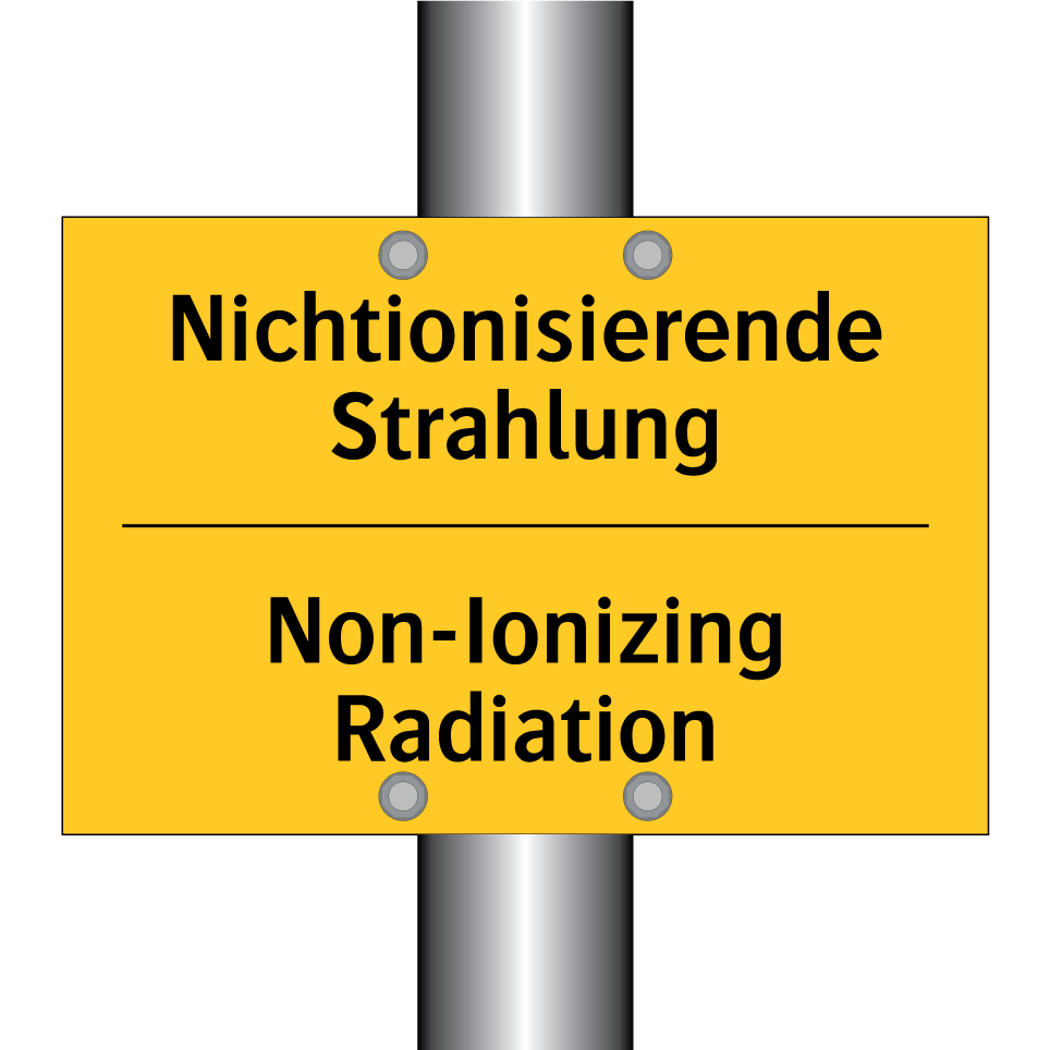 Zweisprachiges Warnschild mit deutschem Text Nichtionisierende Strahlung und englischem Text Non-Ionizing Radiation