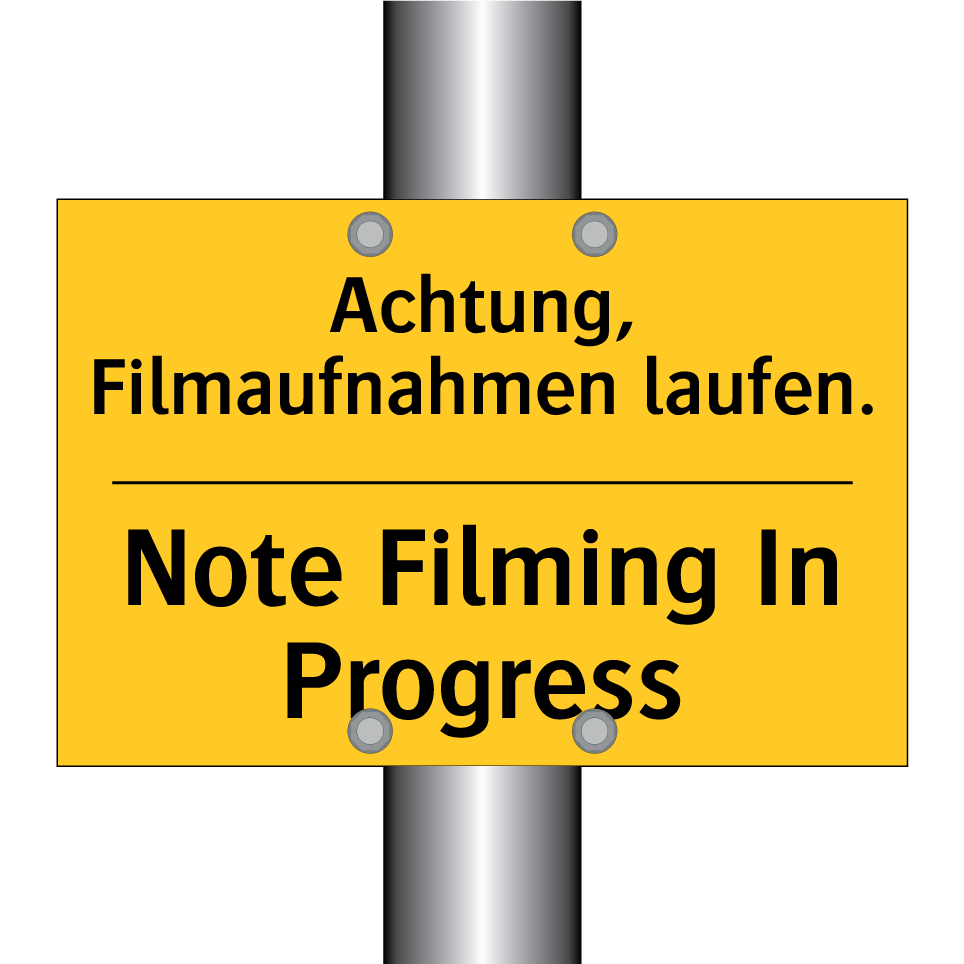 Zweisprachiges Warnschild mit deutschem Text Achtung, Filmaufnahmen laufen. und englischem Text Note Filming In Progress