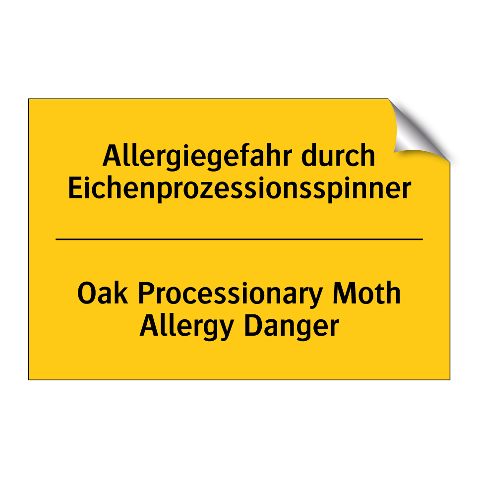 Zweisprachiges Warnschild mit deutschem Text Allergiegefahr durch Eichenprozessionsspinner und englischem Text Oak Processionary Moth Allergy Danger