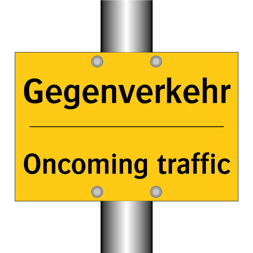Zweisprachiges Warnschild mit deutschem Text Gegenverkehr und englischem Text Oncoming traffic