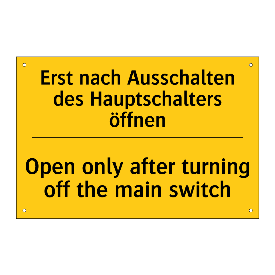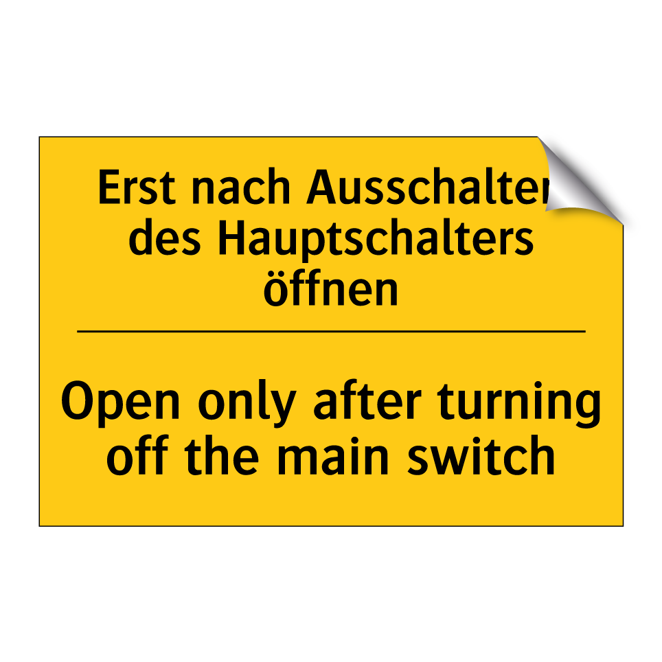 Zweisprachiges Warnschild mit deutschem Text Erst nach Ausschalten des Hauptschalters öffnen und englischem Text Open only after turning off the main switch