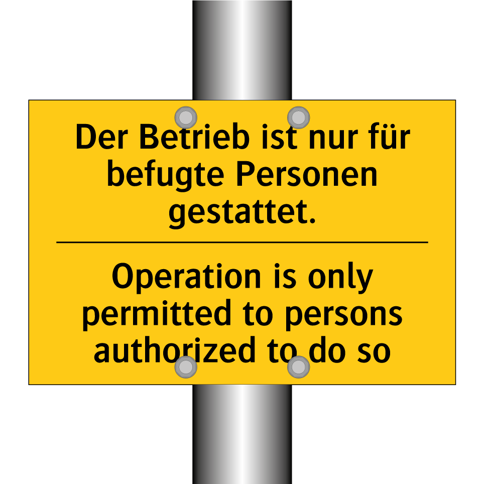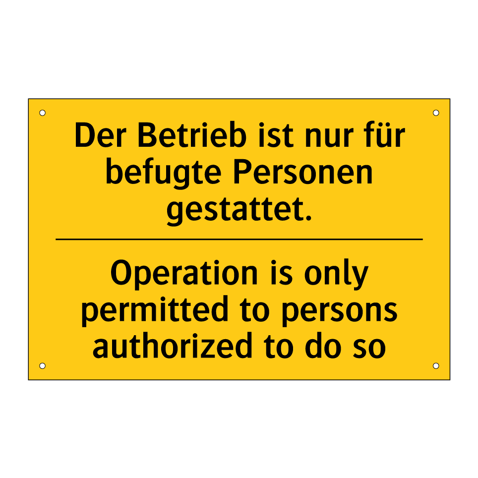 Zweisprachiges Warnschild mit deutschem Text Der Betrieb ist nur für befugte Personen gestattet. und englischem Text Operation is only permitted to persons authorized to do so