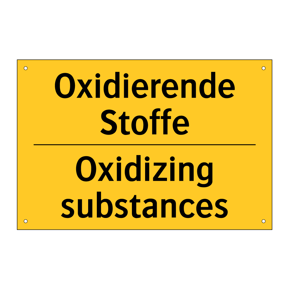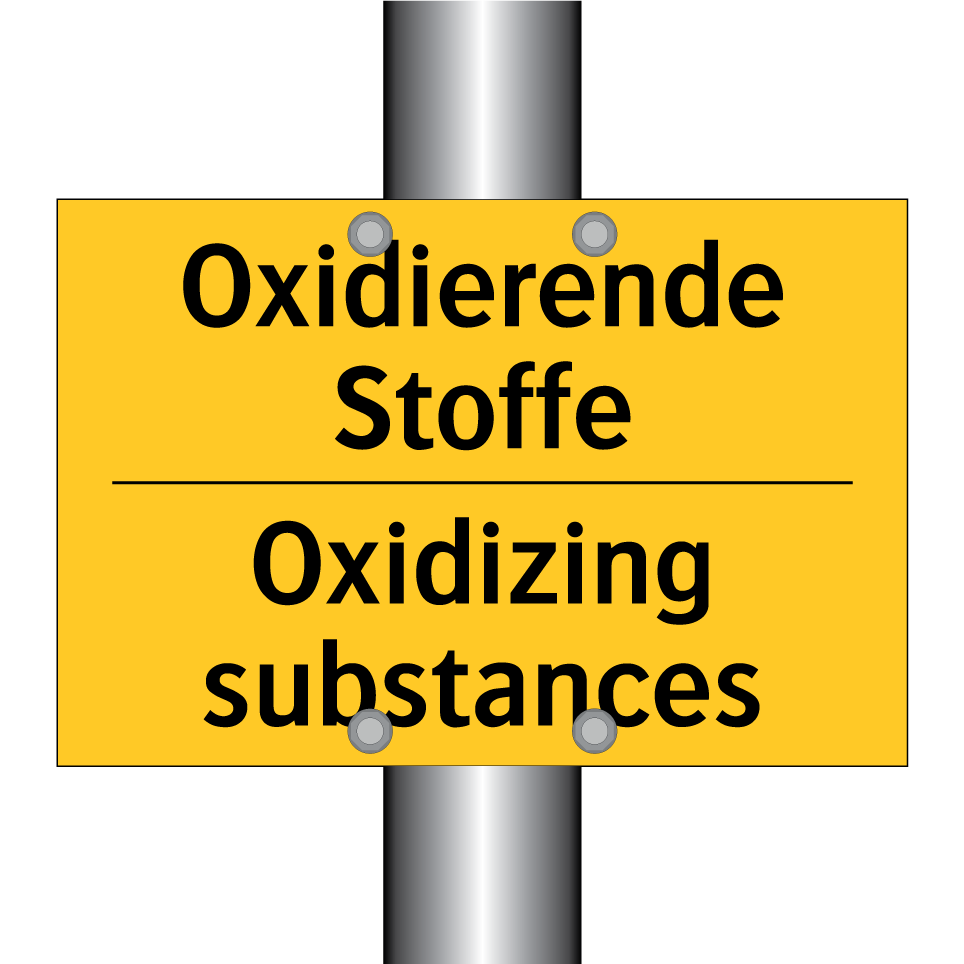 Zweisprachiges Warnschild mit deutschem Text Oxidierende Stoffe und englischem Text Oxidizing substances