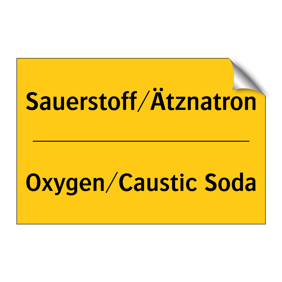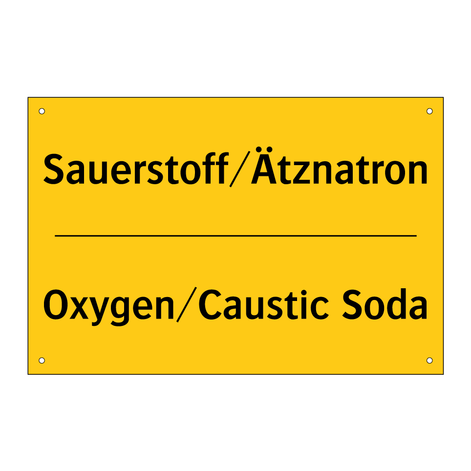 Zweisprachiges Warnschild mit deutschem Text Sauerstoff/Ätznatron und englischem Text Oxygen/Caustic Soda
