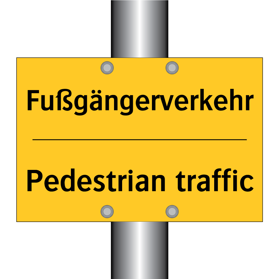 Zweisprachiges Warnschild mit deutschem Text Fußgängerverkehr und englischem Text Pedestrian traffic
