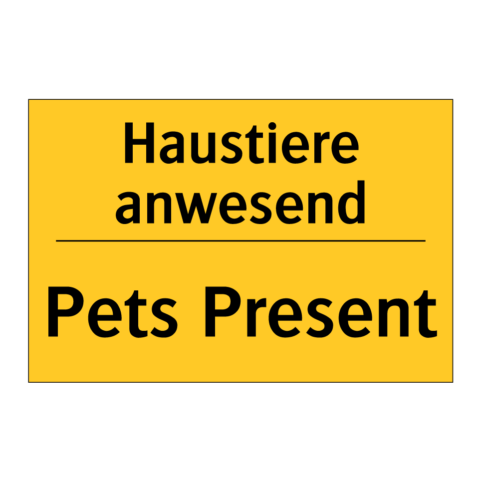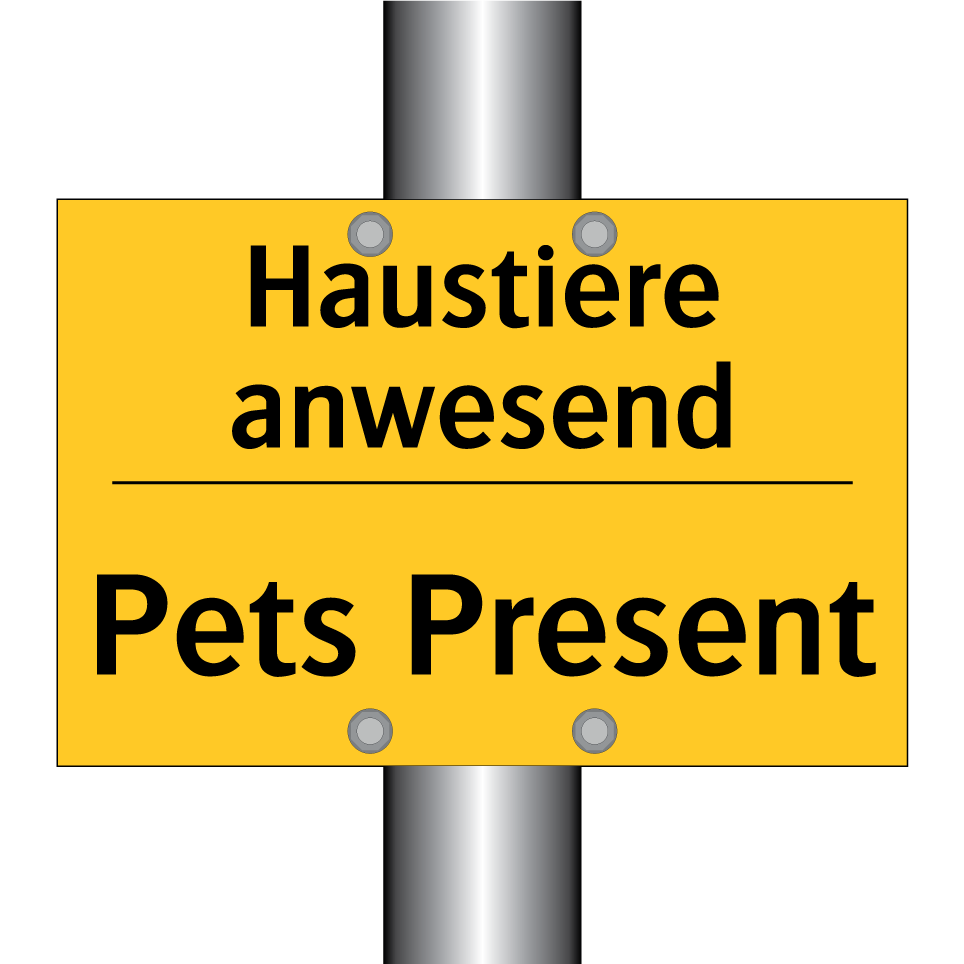Zweisprachiges Warnschild mit deutschem Text Haustiere anwesend und englischem Text Pets Present