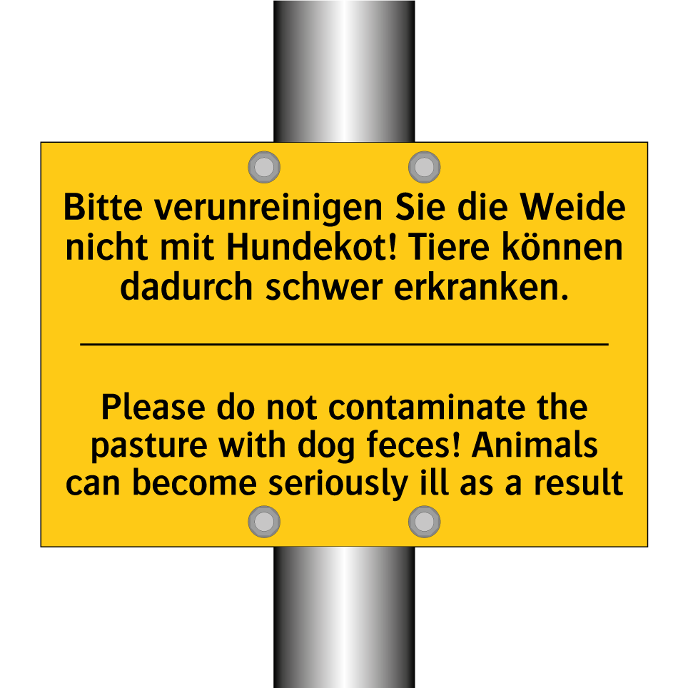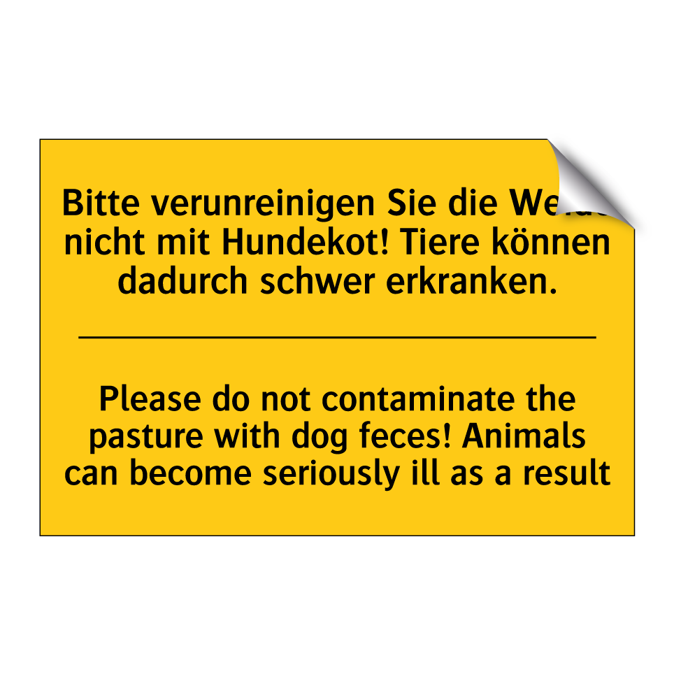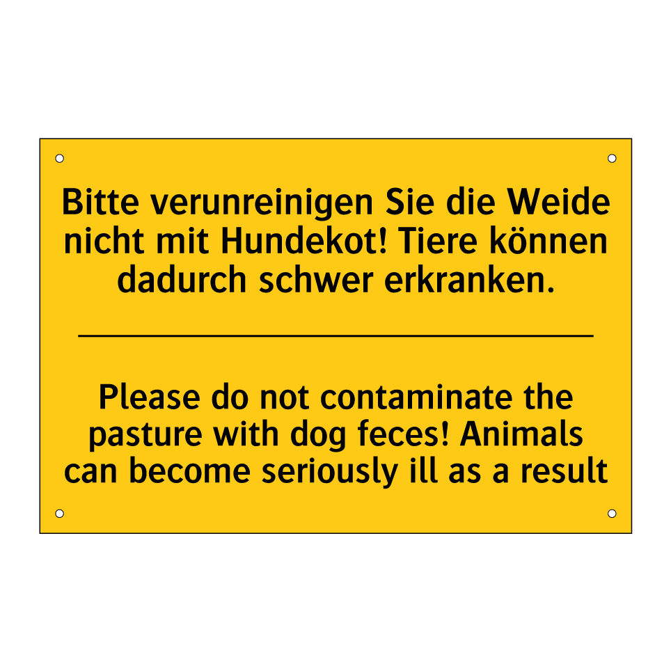 Zweisprachiges Warnschild mit deutschem Text Bitte verunreinigen Sie die Weide nicht mit Hundekot! Tiere können dadurch schwer erkranken. und englischem Text Please do not contaminate the pasture with dog feces! Animals can become seriously ill as a result
