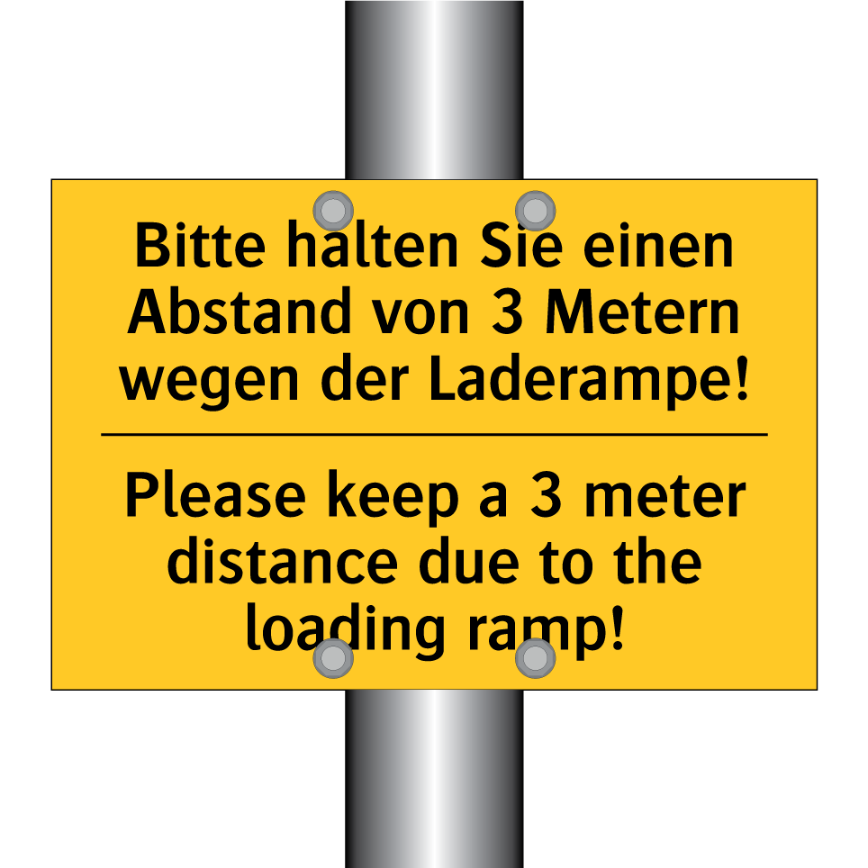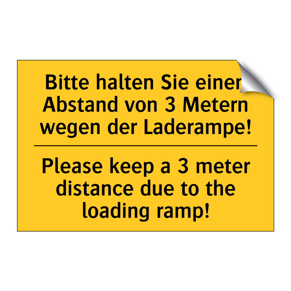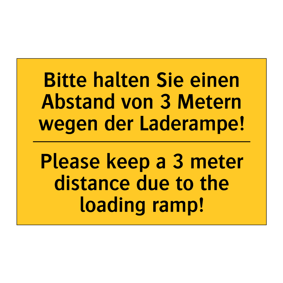 Zweisprachiges Warnschild mit deutschem Text Bitte halten Sie einen Abstand von 3 Metern wegen der Laderampe! und englischem Text Please keep a 3 meter distance due to the loading ramp!
