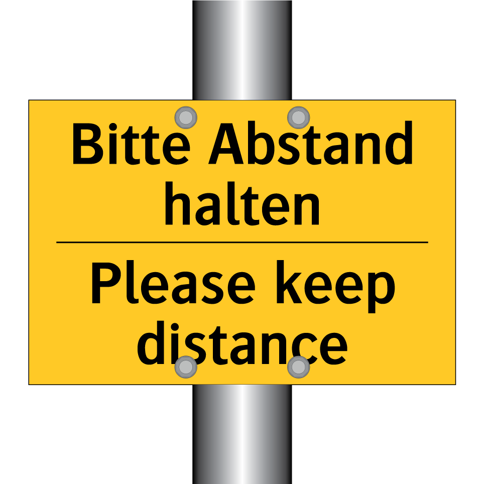 Zweisprachiges Warnschild mit deutschem Text Bitte Abstand halten und englischem Text Please keep distance