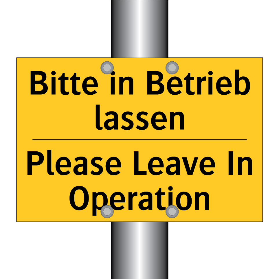 Zweisprachiges Warnschild mit deutschem Text Bitte in Betrieb lassen und englischem Text Please Leave In Operation