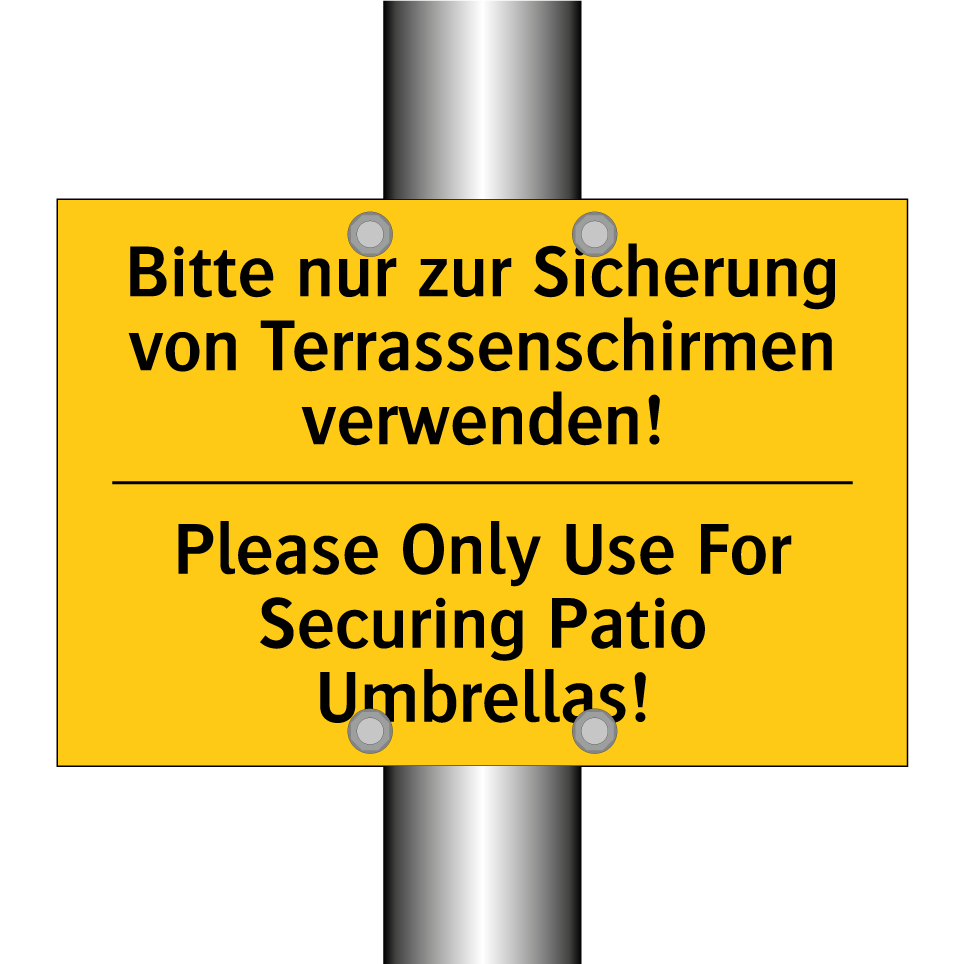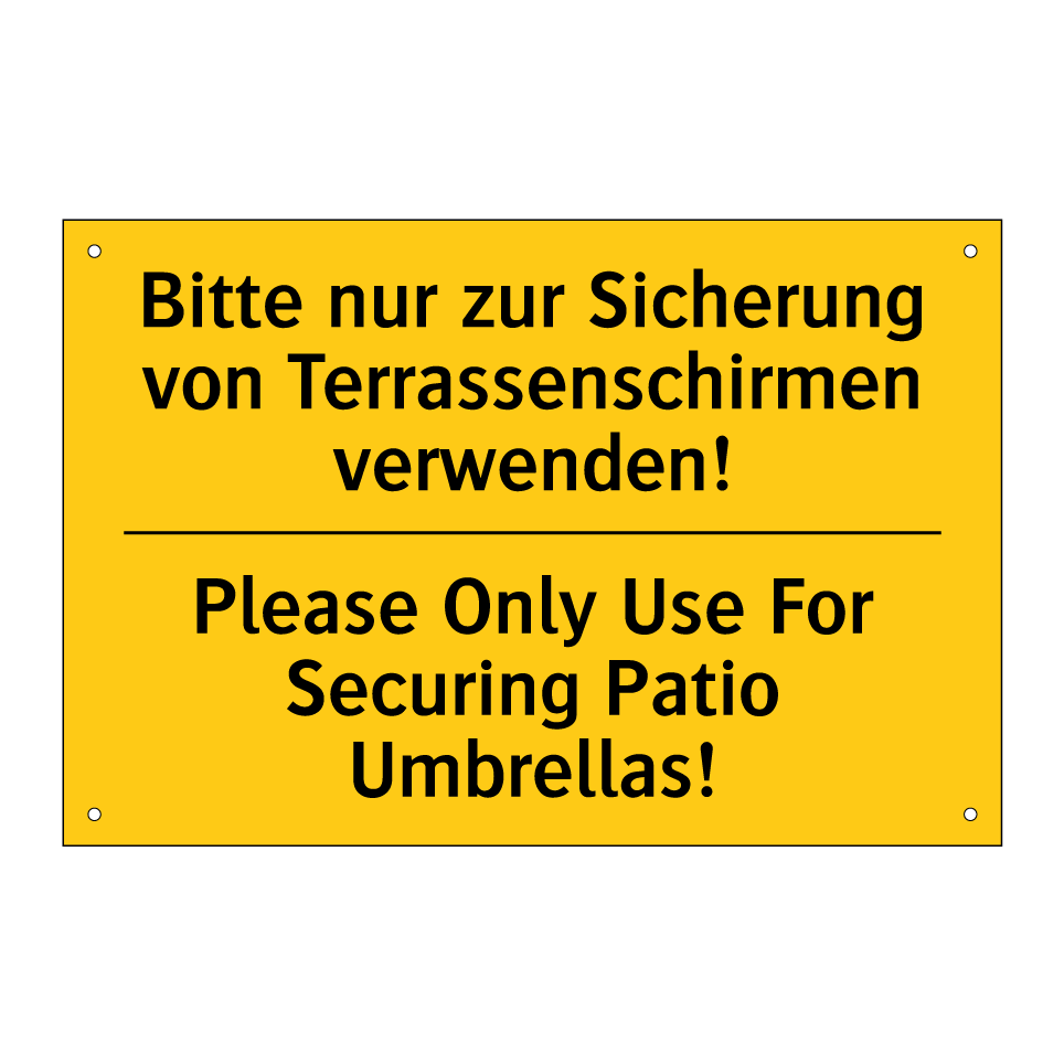 Zweisprachiges Warnschild mit deutschem Text Bitte nur zur Sicherung von Terrassenschirmen verwenden! und englischem Text Please Only Use For Securing Patio Umbrellas!