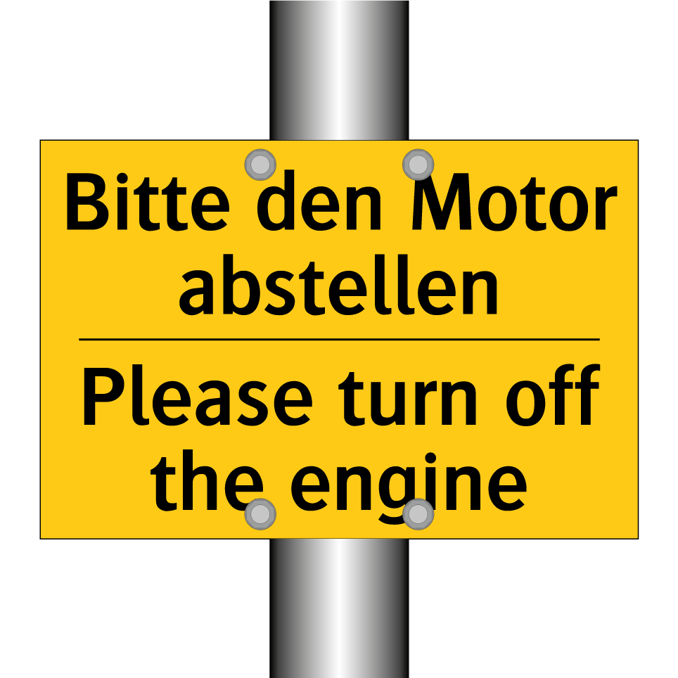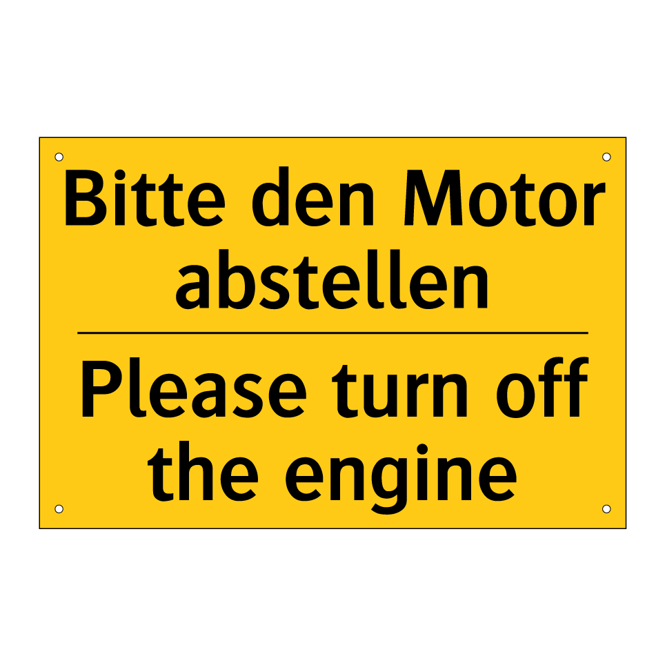 Zweisprachiges Warnschild mit deutschem Text Bitte den Motor abstellen und englischem Text Please turn off the engine