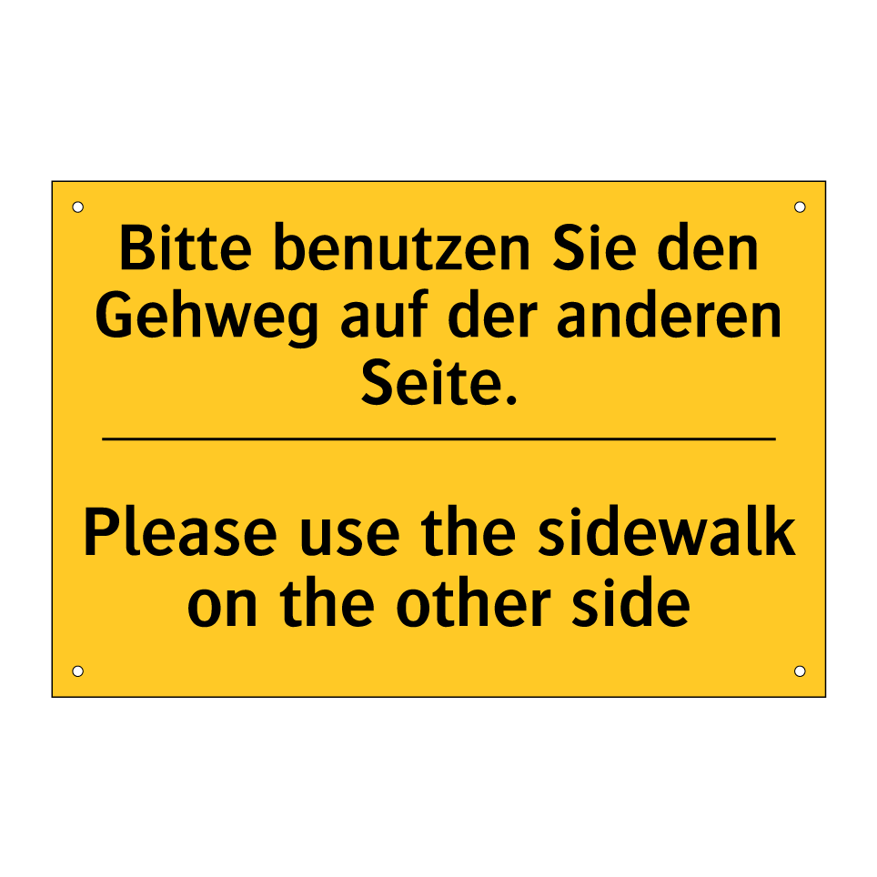 Zweisprachiges Warnschild mit deutschem Text Bitte benutzen Sie den Gehweg auf der anderen Seite. und englischem Text Please use the sidewalk on the other side