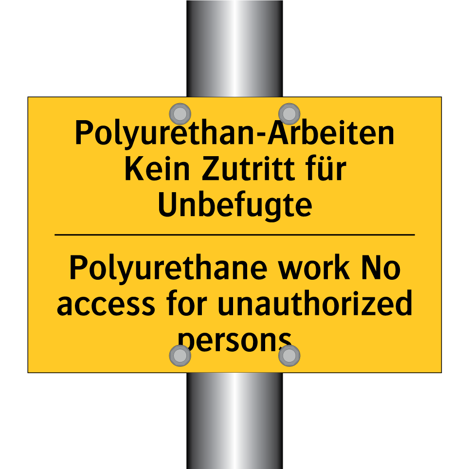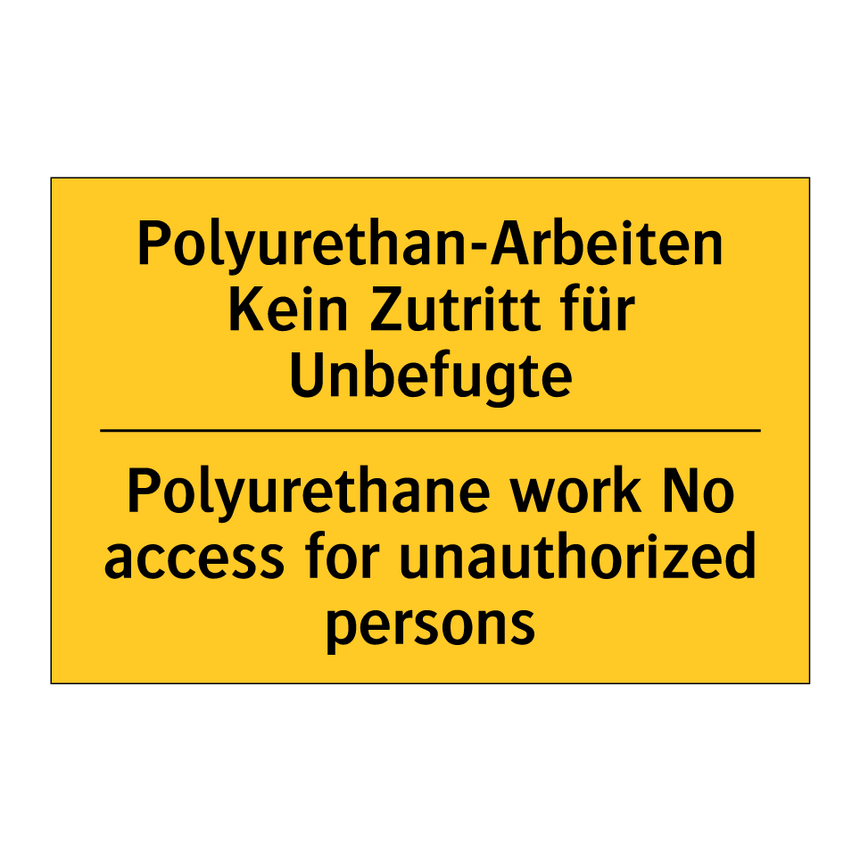 Zweisprachiges Warnschild mit deutschem Text Polyurethan-Arbeiten Kein Zutritt für Unbefugte und englischem Text Polyurethane work No access for unauthorized persons