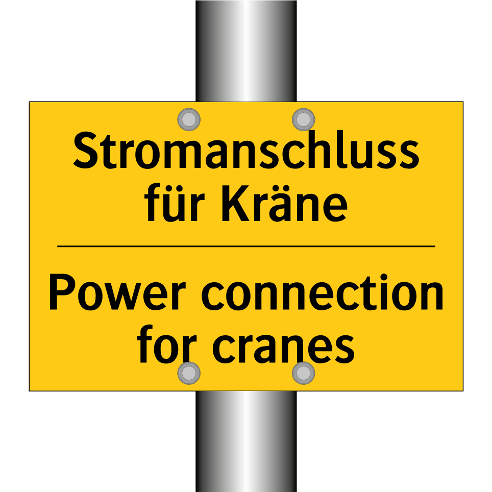 Zweisprachiges Warnschild mit deutschem Text Stromanschluss für Kräne und englischem Text Power connection for cranes
